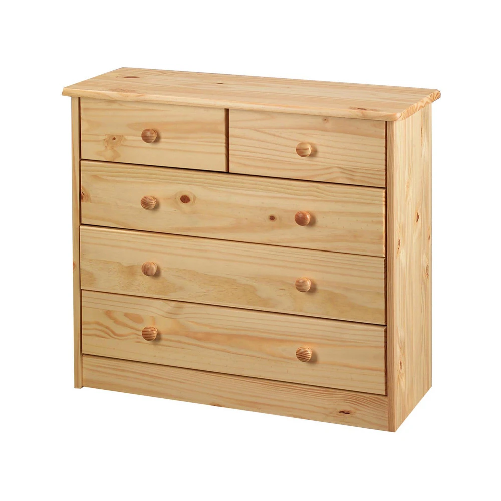 materiál masiv borovice, lakované provedení 2 úzké a 3 široké zásuvky s kovovými pojezdy, hloubka zásuvky 27,5 cm