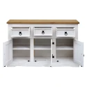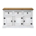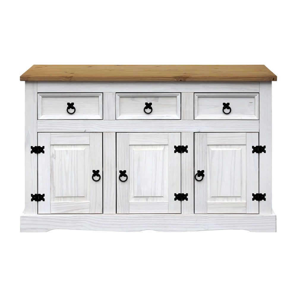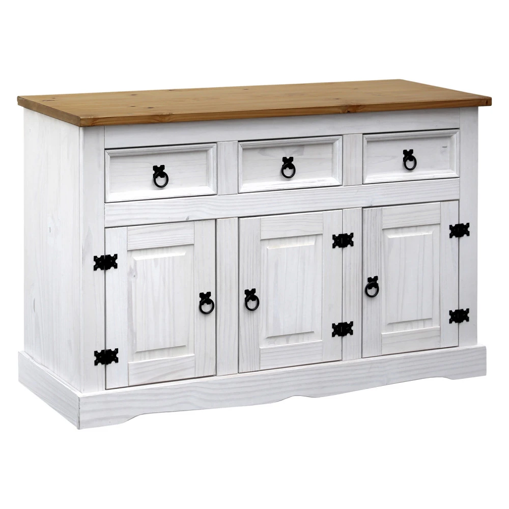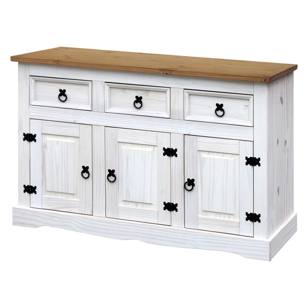 materiál masiv borovice voskovaná v bílém odstínu horní deska masiv borovice voskovaná v medovém odstínu 3 malé zásuvky, 3 dvířka, 1 police, kovové ozdobné úchytky rozměr zásuvky (š/h/v) 31 × 31,5 × 12 cm součást sestavy Corona bílá
