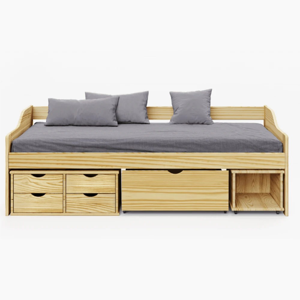Postel zaujme svým promyšleným úložným prostorem, který nabízí opravdu velkorysé možnosti. K dispozici jsou čtyři menší šuplíky, velký zásuvný šuplík, box se zásuvkou a také otevřený box na kolečkách, který lze snadno přesouvat. Tento praktický systém pomáhá udržet pořádek a přehled v místnosti, a přitom elegantně využívá prostor pod lůžkem.