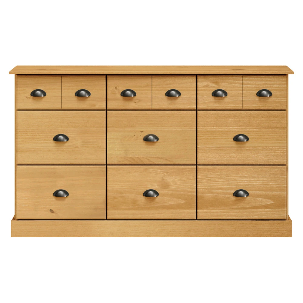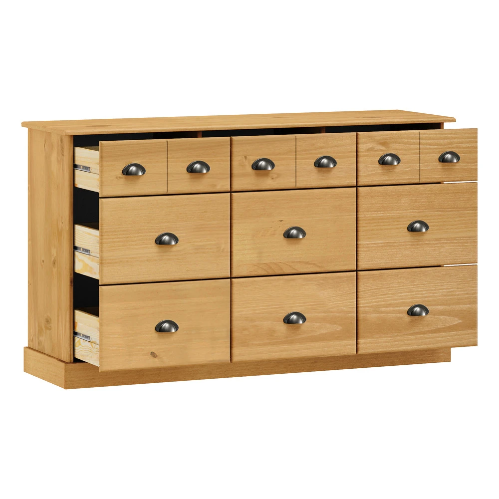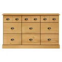 materiál masiv borovice voskovaná v medovém odstínu 6 větších a 3 menší zásuvky s kovovými úchytkami a pojezdy