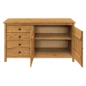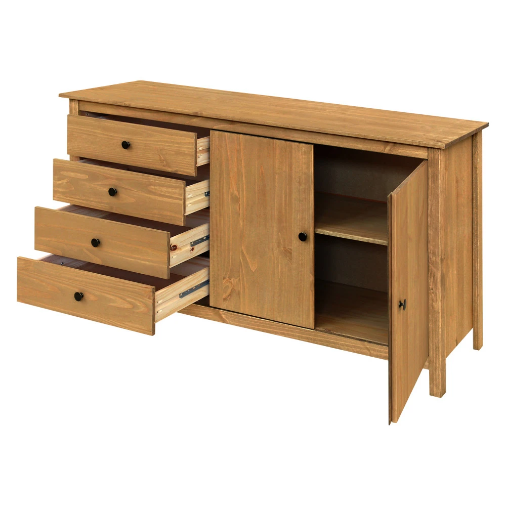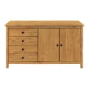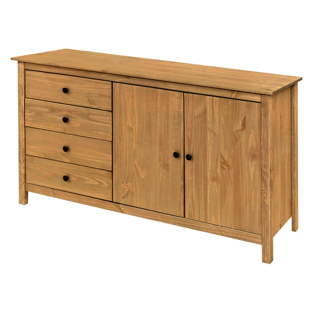 materiál masiv borovice voskovaná v medovém odstínu kovové úchytky v barevném provedení černěná mosaz 4 zásuvky s kovovými pojezdy, 2 plné dveře, 1 police