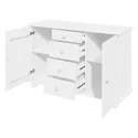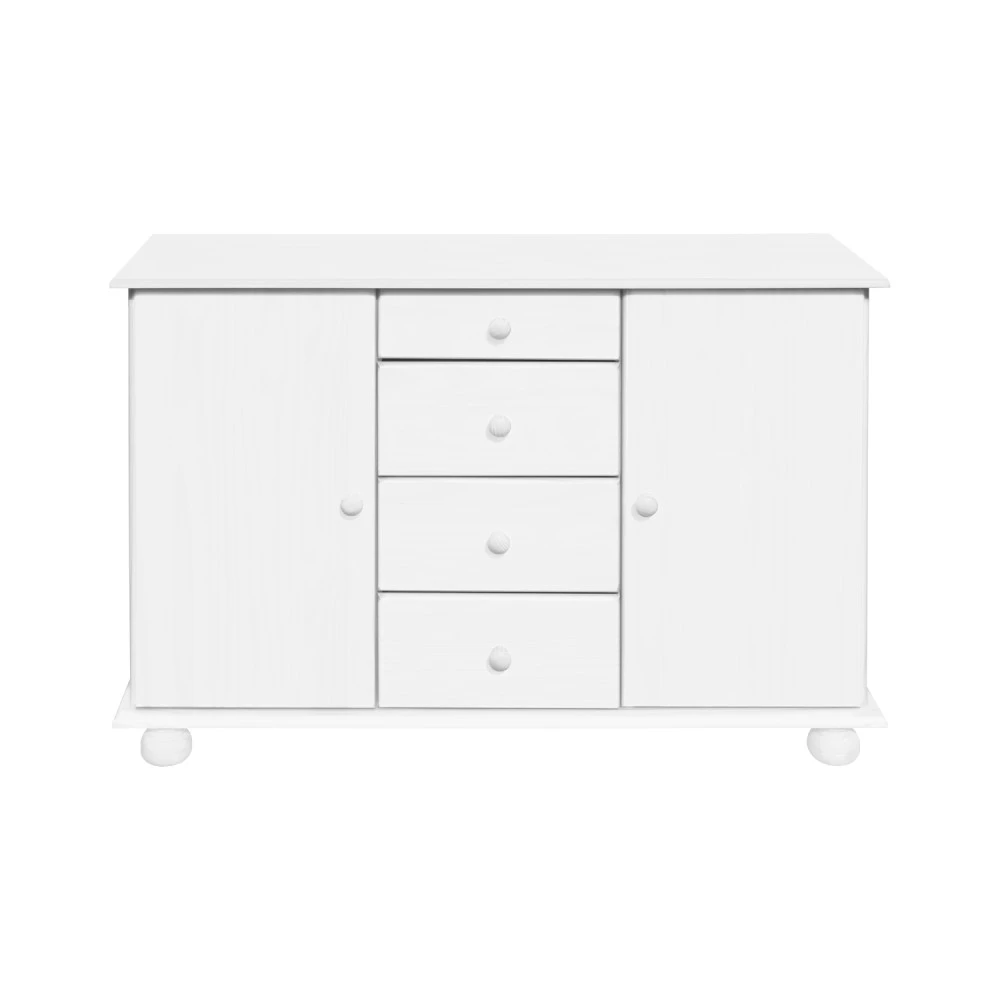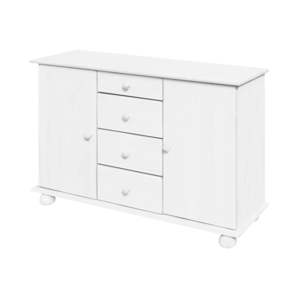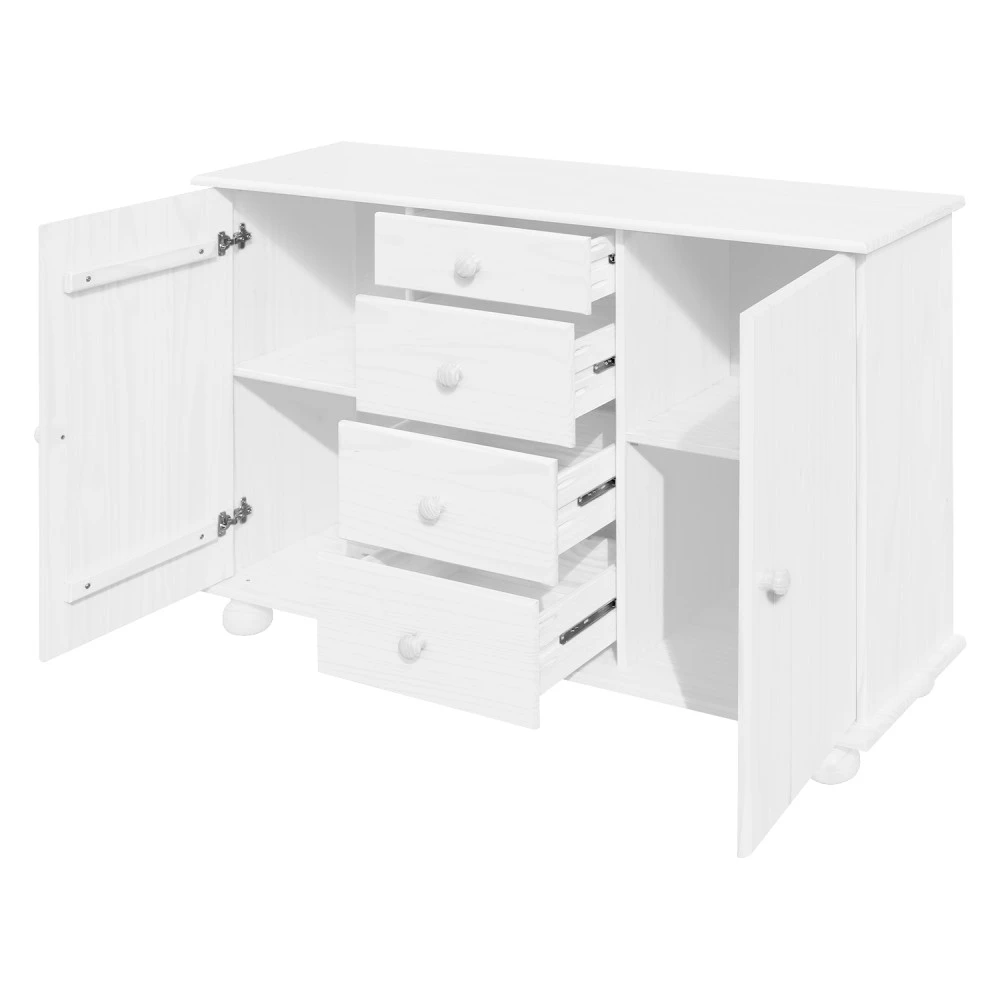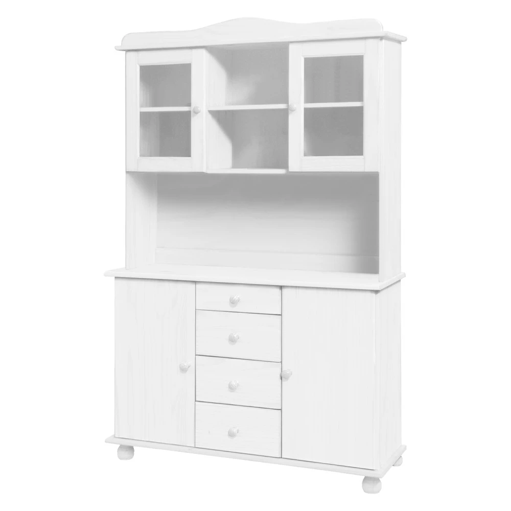 sestava příborníku 8045B a nástavce 8046B materiál masiv borovice, barevné provedení bílý lak příborník: 4 zásuvky s kovovými pojezdy, 2 skříňky s dvířky vybavené policí nástavec: 2 prosklená dvířka rozměr příborníku (š/h/v) 119 × 38 × 81 cm rozměr nástavce (š/h/v) 119 × 30 × 108 cm