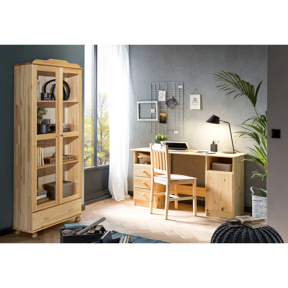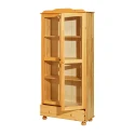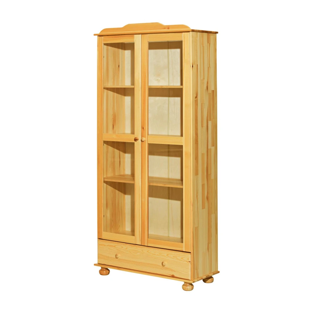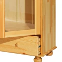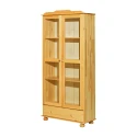 materiál masiv borovice, lakované provedení široká zásuvka s kovovými pojezdy, 2 prosklené dveře 2 variabilní a 1 pevná police