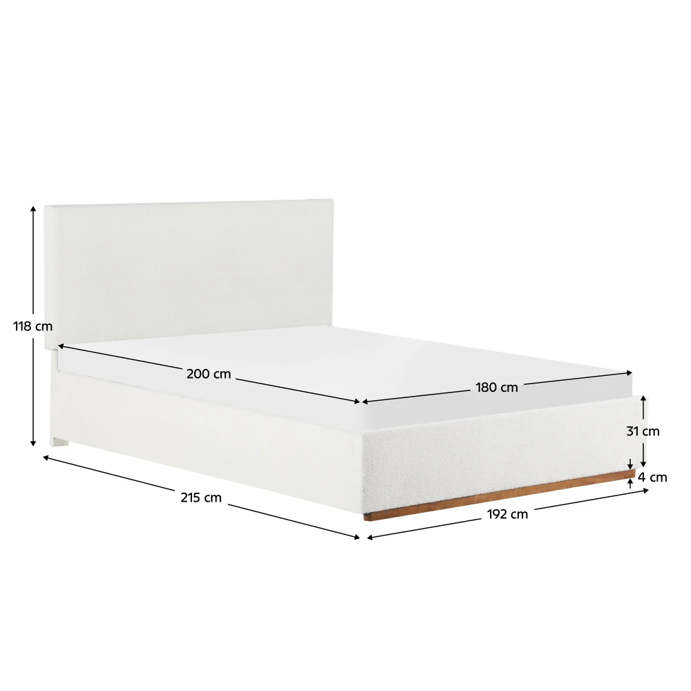 Luxusní čalouněná postel v bílé látce Bouclé přinese do vaší ložnice eleganci, komfort a nadčasový styl. Měkký povrch látky Bouclé působí jemně a příjemně na dotek, zároveň však zaručuje dlouhou životnost díky oděruodolnosti 10 000 Martindale. Postel je vyrobena z kvalitních materiálů – MDF, překližky a kovu, které společně tvoří pevnou a stabilní konstrukci.
