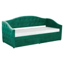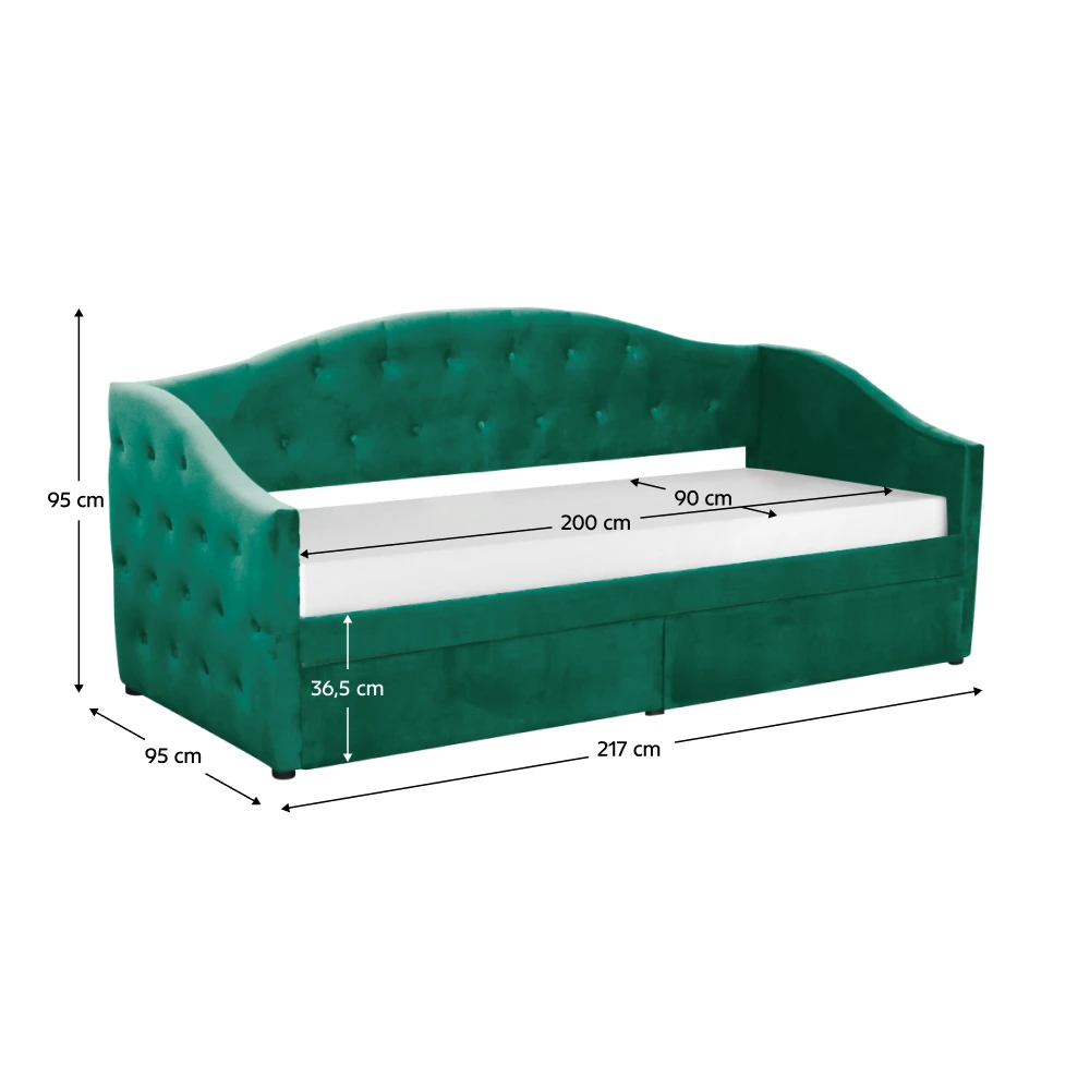 Vneste do svého interiéru svěžest a styl s touto čalouněnou postelí v zeleném sametu. Látka Velvet zaujme svým hebkým povrchem a elegantním vzhledem, zatímco dekorativně prošívané čelo i bočnice dodávají posteli luxusní charakter. Kvalitní konstrukce z DTD, MDF a laminované dýhy zajišťuje stabilitu, odolnost a dlouhou životnost. Postel je vybavena dvěma praktickými šuplíky (vnitřní rozměr 37×91,4×14,8 cm, nosnost 5 kg na zásuvku), které poskytují ideální prostor pro uložení ložního prádla, polštářů či sezónního oblečení.