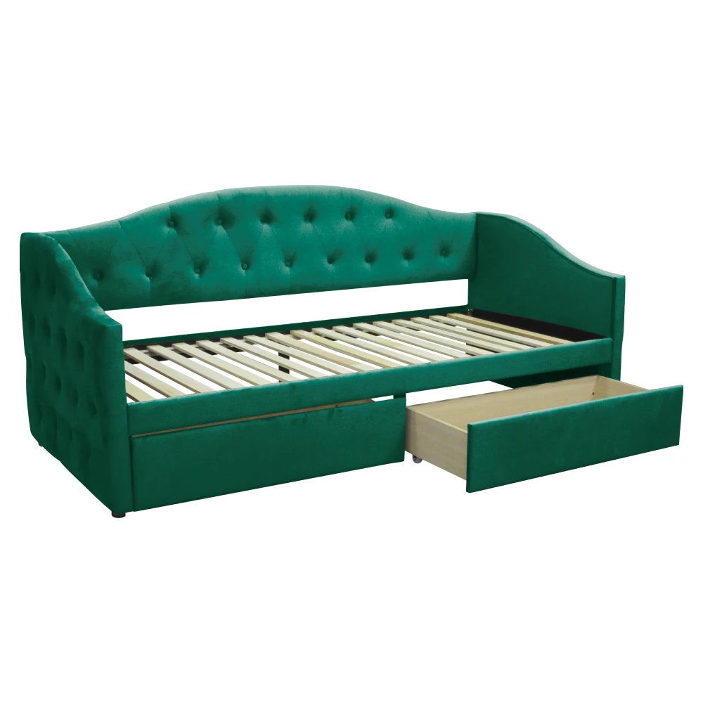 Zelená sametová postel s úložným prostorem a dvěma šuplíky – elegantní a praktická volba