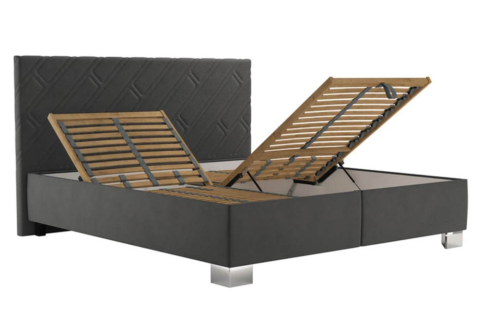 Postel je vybavena praktickým úložným prostorem, který se otevírá od nohou pomocí plynových pístů. Tento systém zaručuje plynulé a snadné otevírání bez nutnosti větší námahy, takže snadno uložíte přikrývky, polštáře nebo sezónní oblečení.