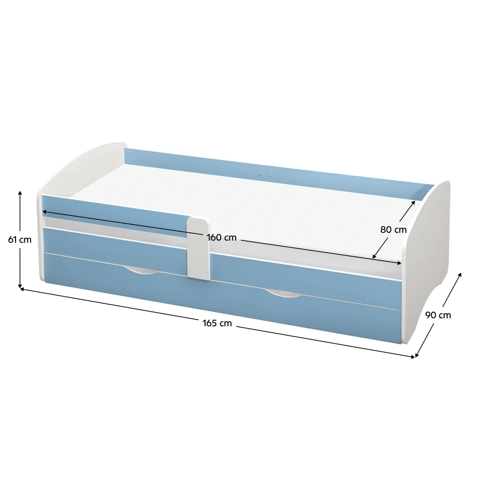 Součástí postele je lamelový rošt, který zajišťuje správnou oporu těla i prodyšnost matrace. Praktický úložný prostor na kolečkách tvoří dva prostorné šuplíky, ideální na lůžkoviny, hračky či oblečení. Díky možnosti montáže zábrany na levou nebo pravou stranu si postel snadno přizpůsobíte konkrétnímu uspořádání pokoje.