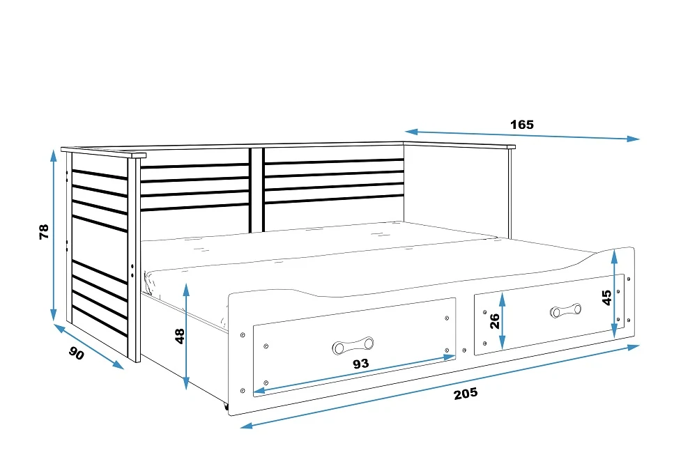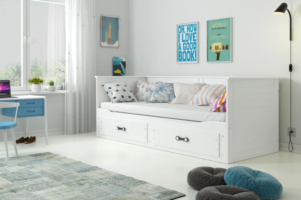 Postel Harwig je vyrobena z odolného lamina a MDF desky, což zaručuje stabilitu, pevnost a dlouhou životnost. Nechybí ani praktické úložné zásuvky, do kterých snadno uložíte lůžkoviny, hračky nebo sezónní oblečení. Nabízíme ji ve dvou moderních barevných variantách – bílá a grafit, takže se skvěle přizpůsobí jakémukoli interiéru.