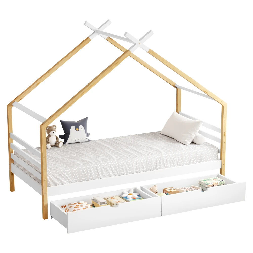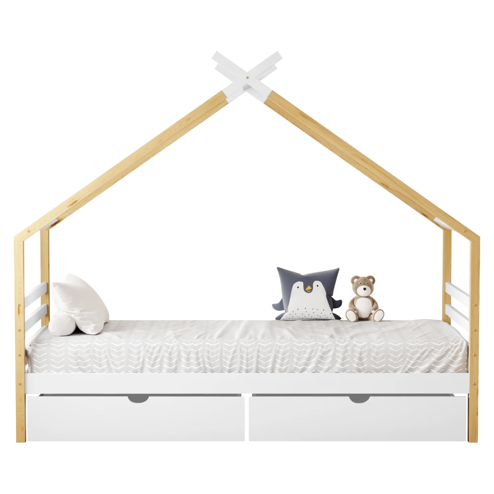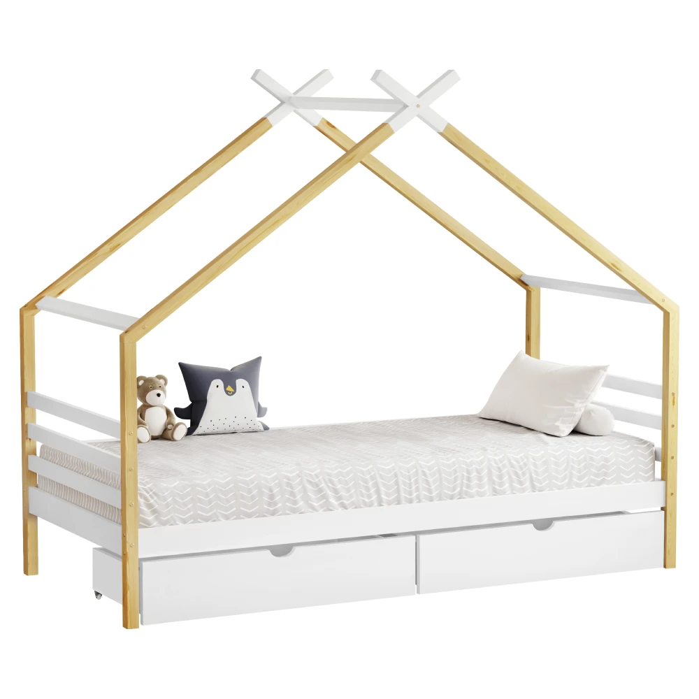 Hravá a zároveň praktická postel ve tvaru domečku z masivního borového dřeva v kombinaci bílé a hnědé barvy je ideální volbou do dětského pokoje. Spojuje útulný design s funkčností a vytváří místo nejen pro spaní, ale i pro hraní.