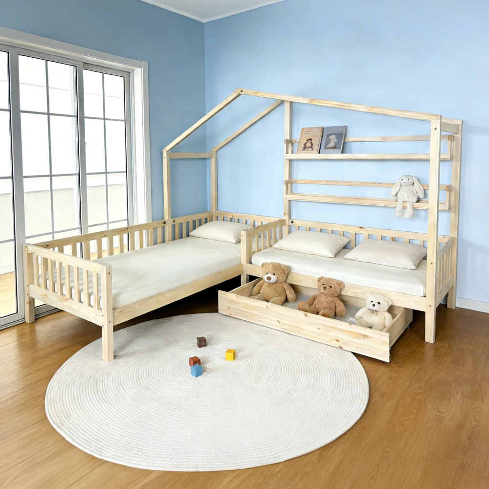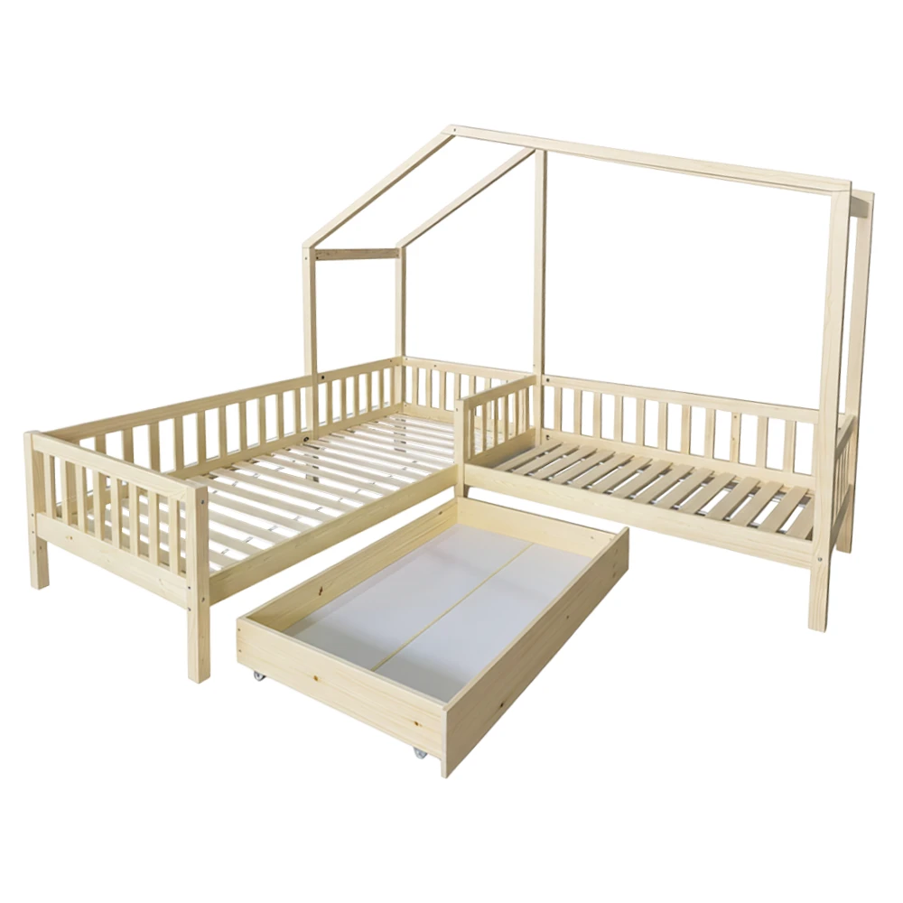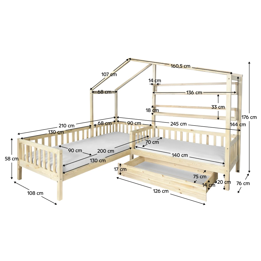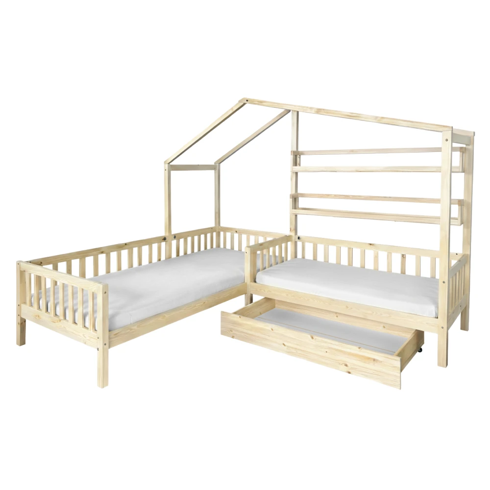 Stylová dětská patrová postel ve tvaru domečku do L je ideální volbou pro sourozence i menší dětské pokoje. Kombinuje hravý design s praktickým využitím prostoru a vytváří útulné místo na spaní i hraní.