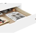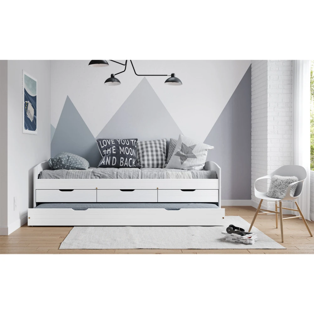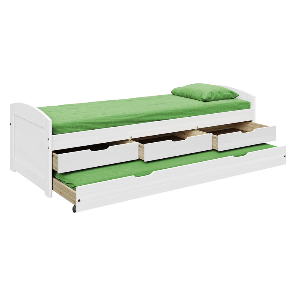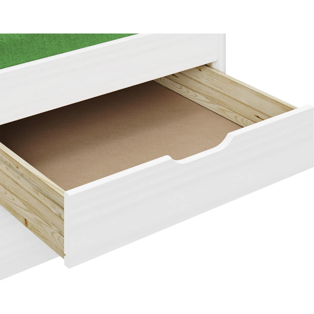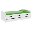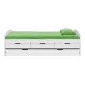 materiál masiv borovice, barevné provedení bílý lak model ULLI, výška sedu 52 cm, praktické úložné prostory pod postelí (3 zásuvky a výsuv) jsou v ceně cena včetně roštu (dřevěný laťkový) bez matrace, doporučený rozměr matrace 90 × 200 cm doporučená výška matrace pro přistýlku je do 10 cm