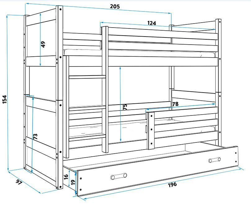 Součástí postele jsou dva lamelové rošty, dvě pěnové matrace o výšce 7 cm a praktický úložný prostor na kolečkách, který se skvěle hodí na ukládání hraček, lůžkovin nebo oblečení. Ložná plocha činí 2× 90×200 cm, doporučená nosnost každého lůžka je 70 kg.