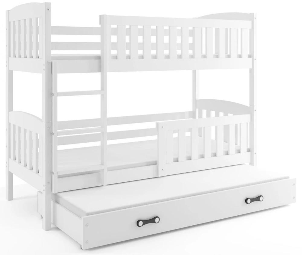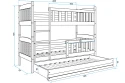 Velkou výhodou je praktická přistýlka s vlastní matrací, kterou využiješ pro třetí dítě, nebo když u dětí zůstane přes noc kamarád či příbuzný. Všechny části postele mají lamelový rošt i pěnovou matraci v ceně. Tloušťka matrace je 7 cm. Ložná plocha činí 90×200 cm (horní i dolní lůžko) a 80×190 cm (přistýlka).