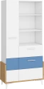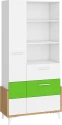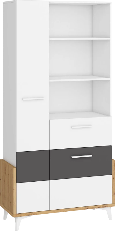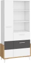 Regál je vybavený 1 zásuvkou, 2 skříňkami (pod zásuvkou uvnitř 1 police, po straně uvnitř 4 police) a 3 policovými prostory a dodáváme jej v demontu.