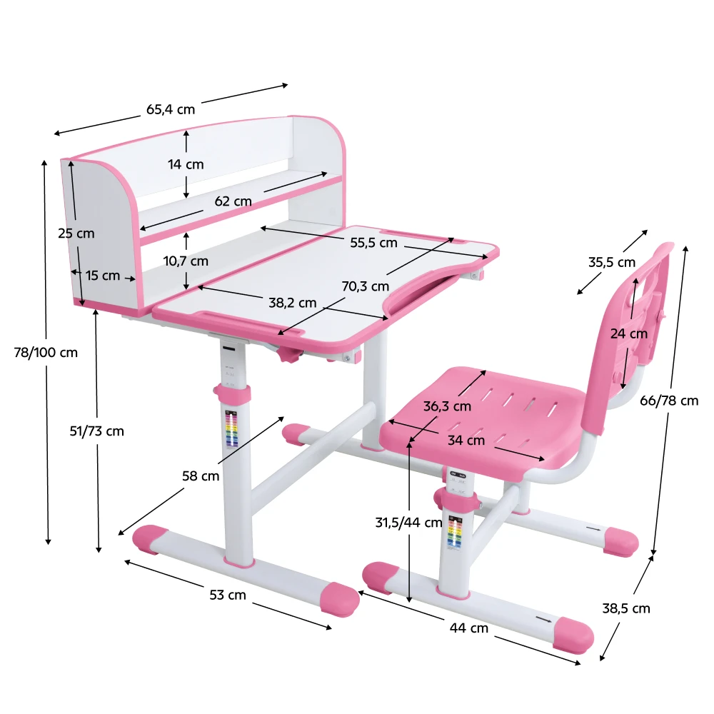 Rostoucí set stolu a židle v kombinaci růžové a bílé barvy je ideální volbou pro děti od 3 do 12 let. Díky promyšlenému ergonomickému provedení podporuje správné držení těla a přispívá ke zdravému vývoji páteře.