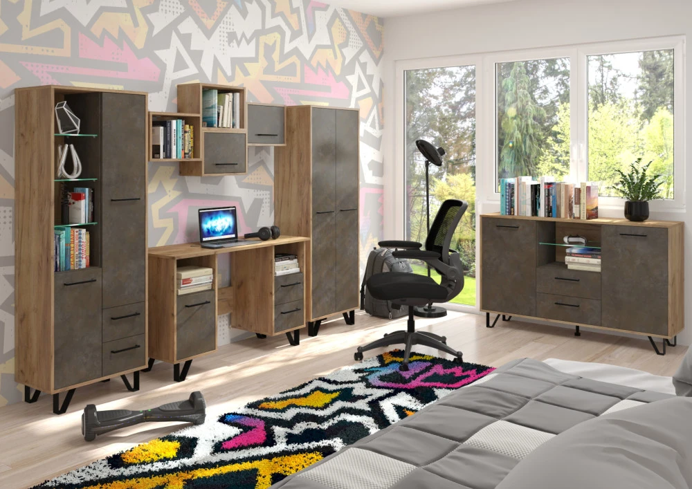 Studentský pokoj Boss vás zaujme svým moderním elegantním designem a barevným provedením s přírodními detaily. Jednotlivé komodity jsou vyrobeny z kvalitních lamino desek o síle 16 mm. Desky mají ABS hranění, které zvyšuje odolnost pro odštípnutí hran. Součástí zásuvek a dvířek jsou jednoduché kovové úchyty a zároveň mají zabudovaný systém tichého dovírání. Nábytek stojí na kovových nožkách, které provzdušní váš interiér. Nabízíme vám několik barevných variant.Pokoj je sestaven z jednotlivých komodit systému Boss, ze kterých si vytvoříte svůj vysněný obývací pokoj, relaxační místnost či pracovnu.
