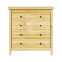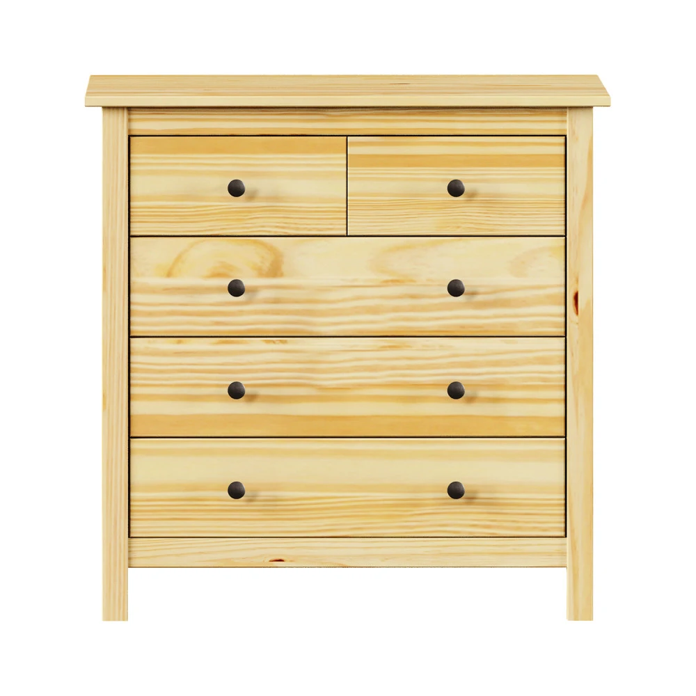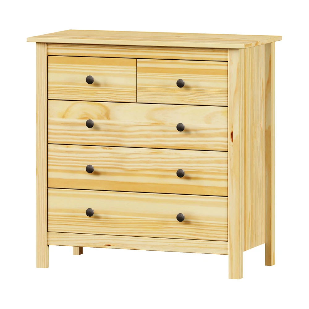 materiál masiv borovice, lakované provedení kovové úchytky 2 menší a 3 větší zásuvky s kovovými pojezdy