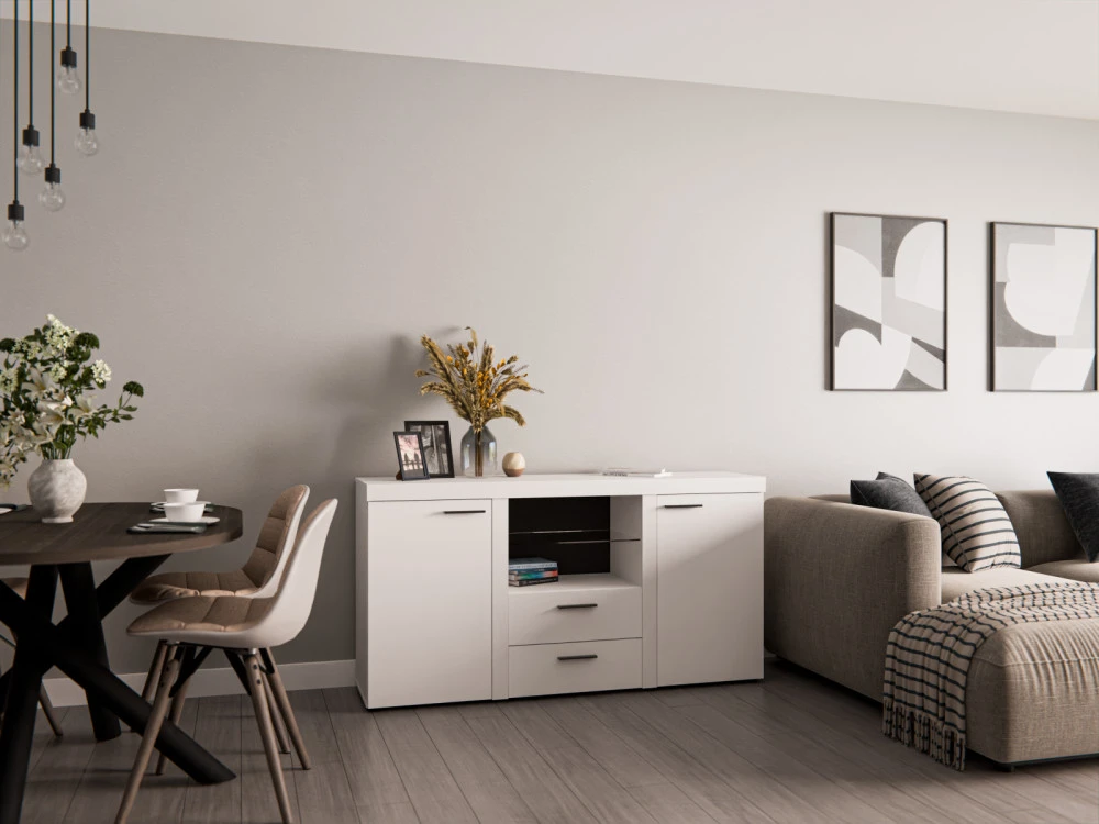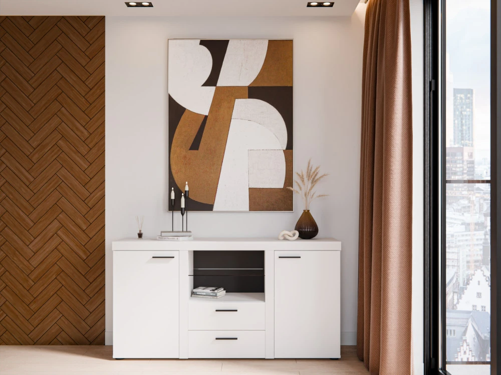 Komoda Rizo je nejen skvělým doplňkem k bytové stěně Rizo. Stejně výborně poslouží jako samostatný kus nábytku. Komoda má univerzální využití a nabízí dostatek úložného prostoru. Komoda je vyrobena z odolného a stálobarevného lamina. Komoda je dodávaná v demontu. Součástí balení je schematický montážní návod, včetně všech potřebných spojovacích prvků. Vyobrazené doplňky, LED osvětlení a dekorace nejsou v ceně.