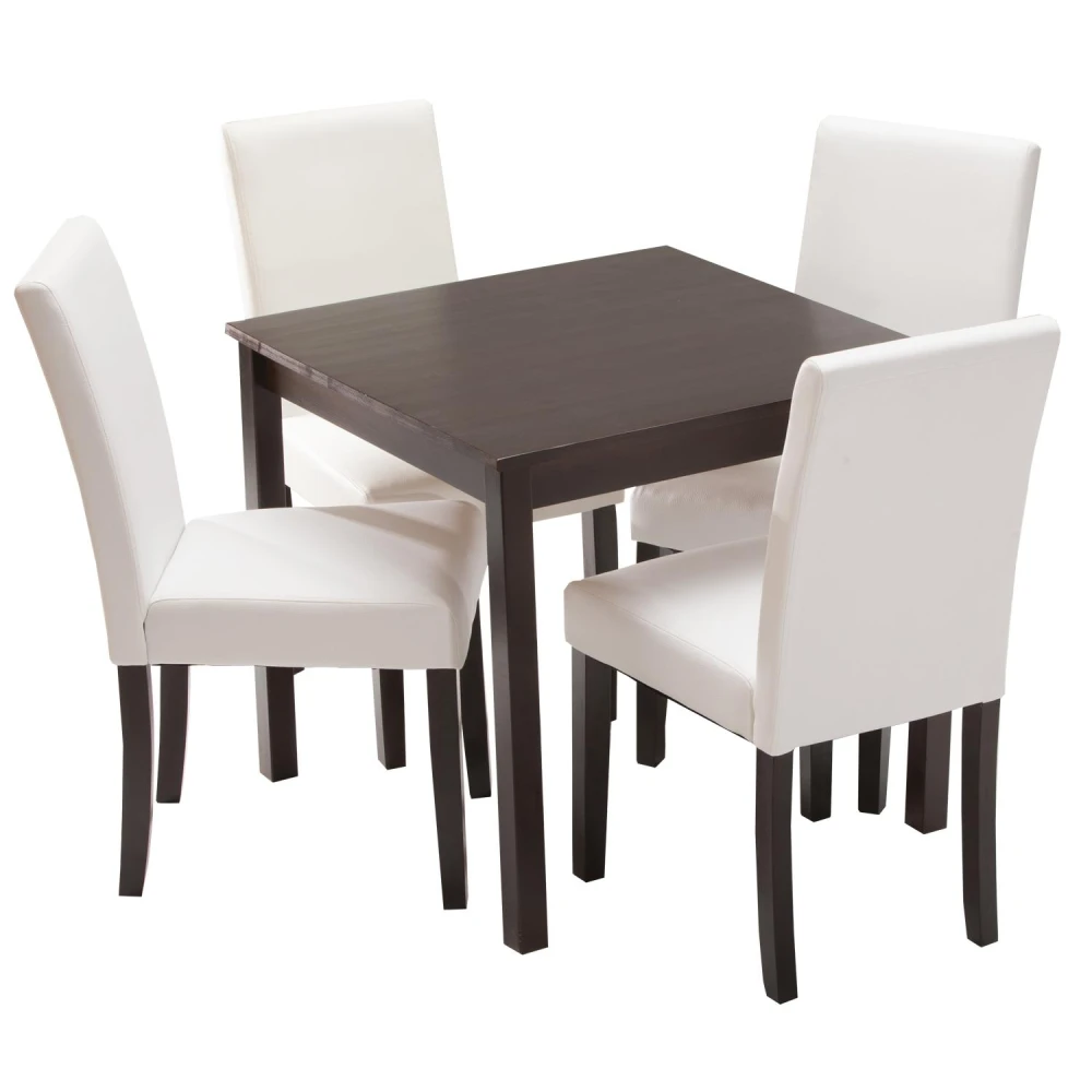 jídelní stůl 8842H a 4 jídelní židle PRIMA 3036 stůl masiv tmavohnědý lak, židle nohy z masivu, barevné provedení tmavě hnědý lak potah kůže – imitace, barevné provedení bílá, výška sedu 47 cm rozměr stolu (š/h/v) 75 × 75 × 73 cm, rozměr židle (š/h/v) 42 × 48 × 92 cm