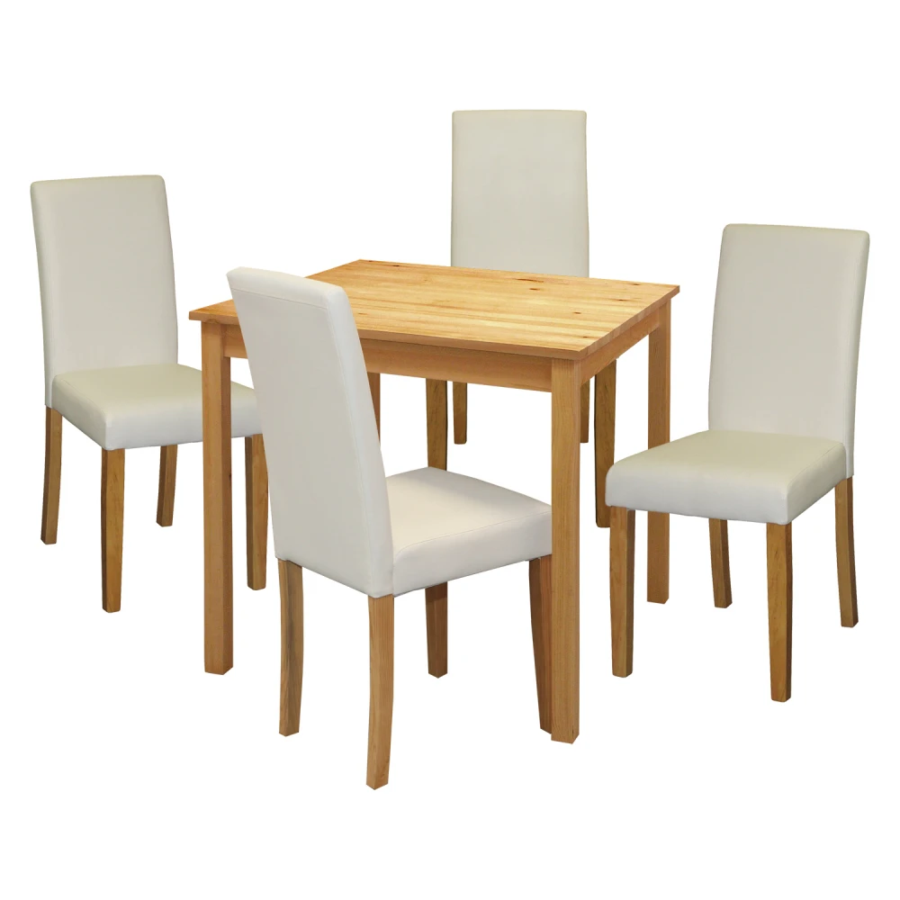jídelní stůl 8842 a 4 jídelní židle PRIMA 3037 stůl masiv borovice, lakované provedení židle nohy z masivu, barevné provedení čirý lak potah kůže – imitace, barevné provedení bílá, výška sedu 47 cm rozměr stolu (š/h/v) 75 × 75 × 73 cm, rozměr židle (š/h/v) 42 × 48 × 92 cm