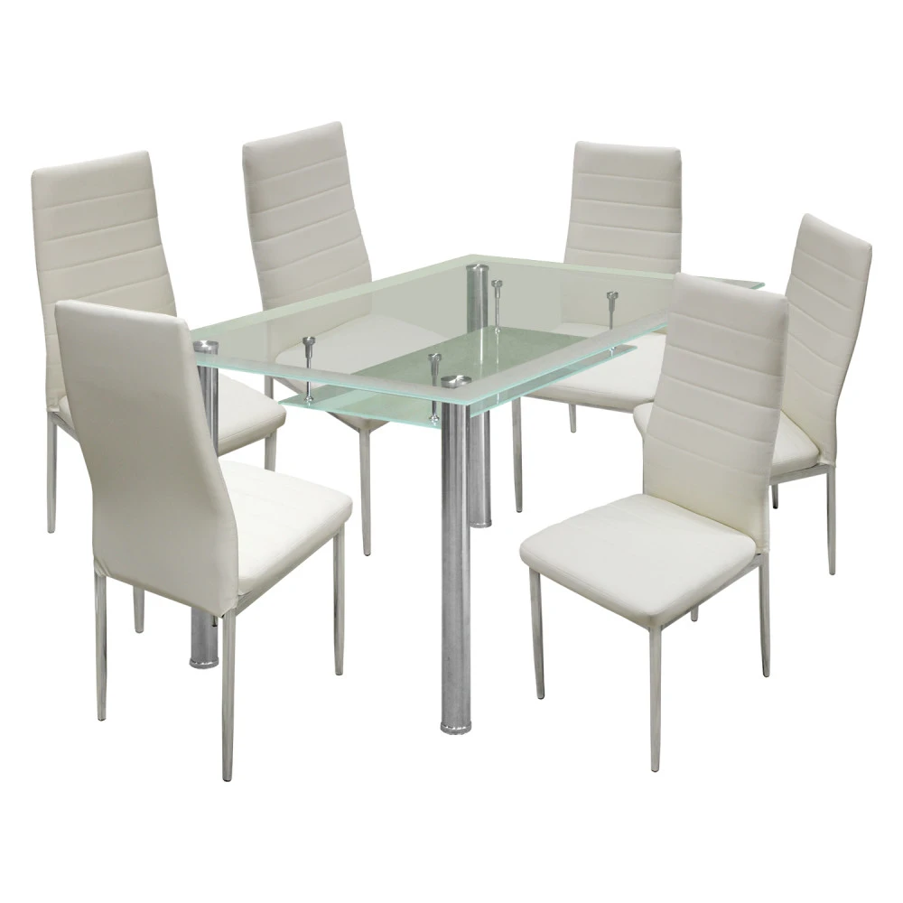 jídelní stůl VENEZIA 3007 a 6 jídelních židlí MILÁNO 3009 stůl v kombinaci kov / tvrzené sklo, chromované nohy židle potah kůže – imitace, barevné provedení bílá kovové chromované nohy, výška sedu 46 cm rozměr stolu (š/h/v) 150 × 90 × 76 cm, rozměr židle (š/h/v) 41 × 40 × 98 cm