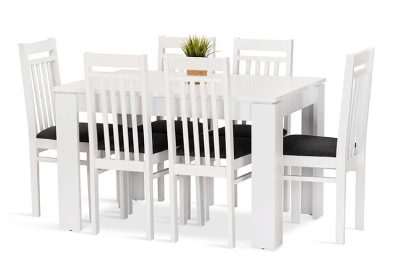 Jídelní sestava Dante 6 se skládá ze stolu a šesti židlí. Tato jídelní sestava splní svůj účel na výbornou nejen v kuchyni, ale i v jídelně, nebo obývacím pokoji s jídelním koutem. Svou vysokou kvalitou a precizním zpracováním, uspokojí všechny budoucí, i ty velmi náročné, uživatele. Stůl je vyrobený z bílého matného lamina tl.22 mm, kostry židlí z bukového dřeva, barveného na bílou barvu. Jídelní sestava je dodávaná v demontu. Součástí balení je schématický montážní návod, včetně všech potřebných spojovacích prvků. Cena je uvedena za jídelní stůl a 6 židlí. Úvodní fotografie je ilustrační. Židle budou dodané v zelené barvě.