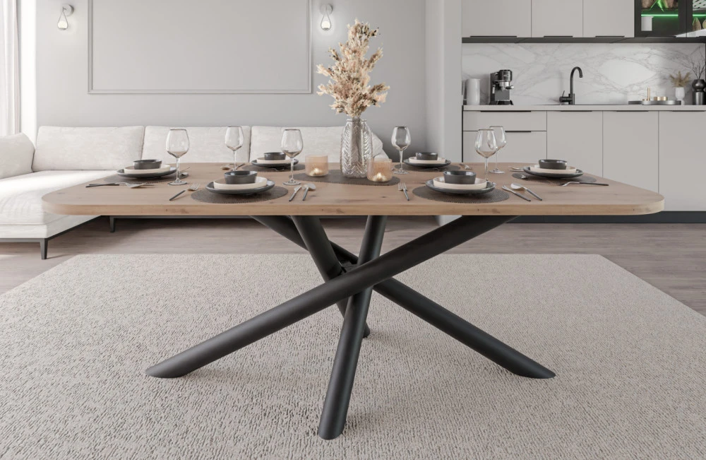 Jídelní stůl Osman je vyrobený v nadčasovém stylu, který se hodí do každé moderní domácnosti. Deska stolu je z lamina tl.15 mm, nohy jsou černé kovové ve stylu "pavouk". Stůl se skvěle hodí nejen do jídelny, ale i do kuchyně nebo do jídelního koutu v obývacím pokoji. Stůl je dodávaný v demontu. Součástí balení je montážní návod včetně všech spojovacích prvků.