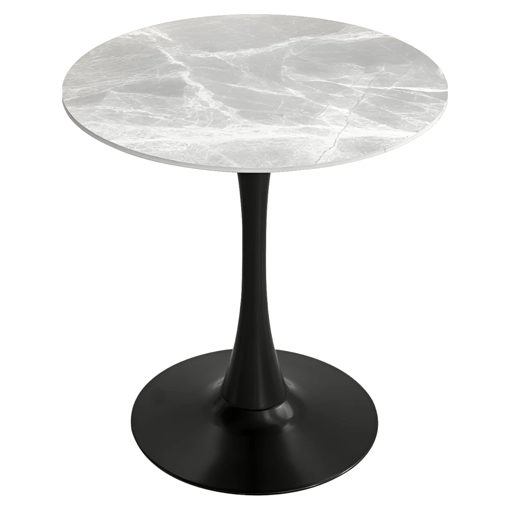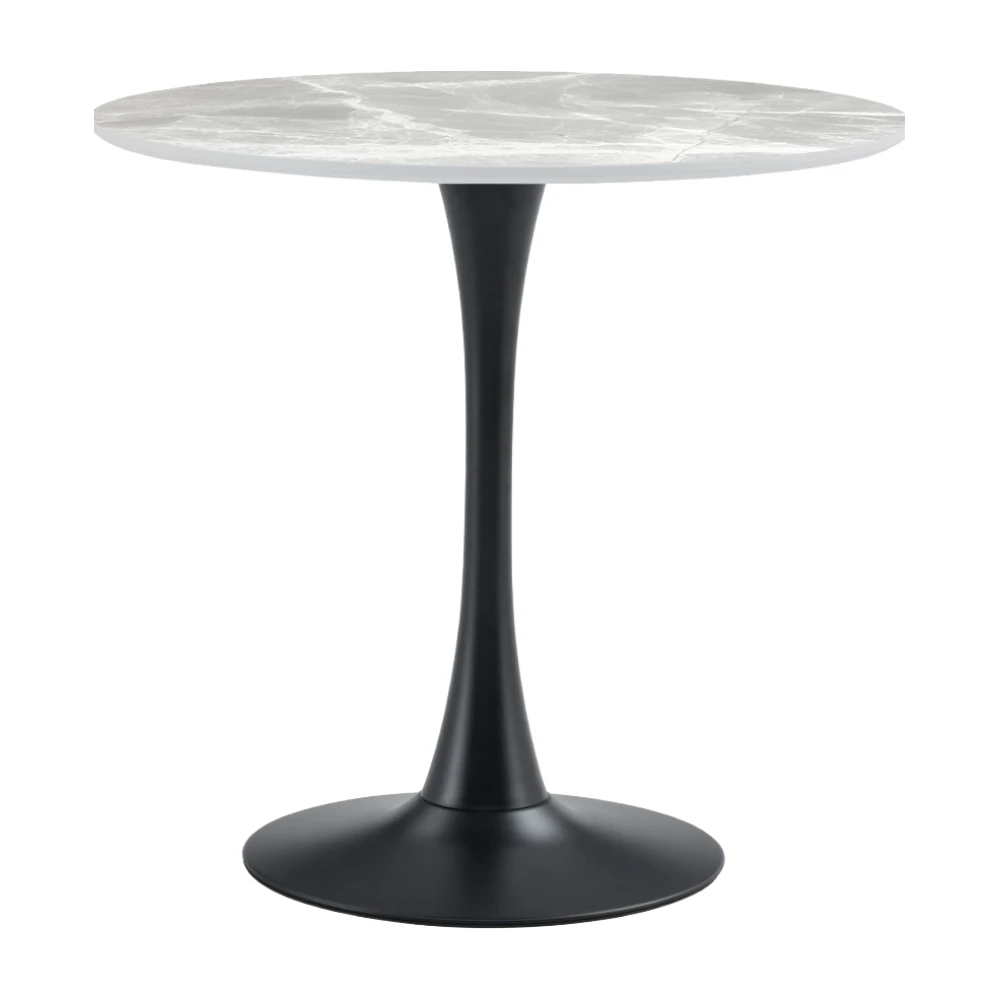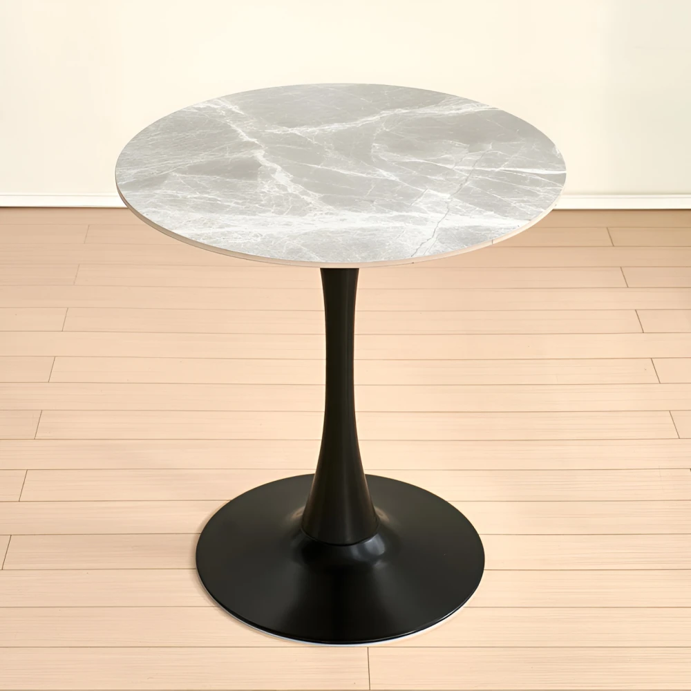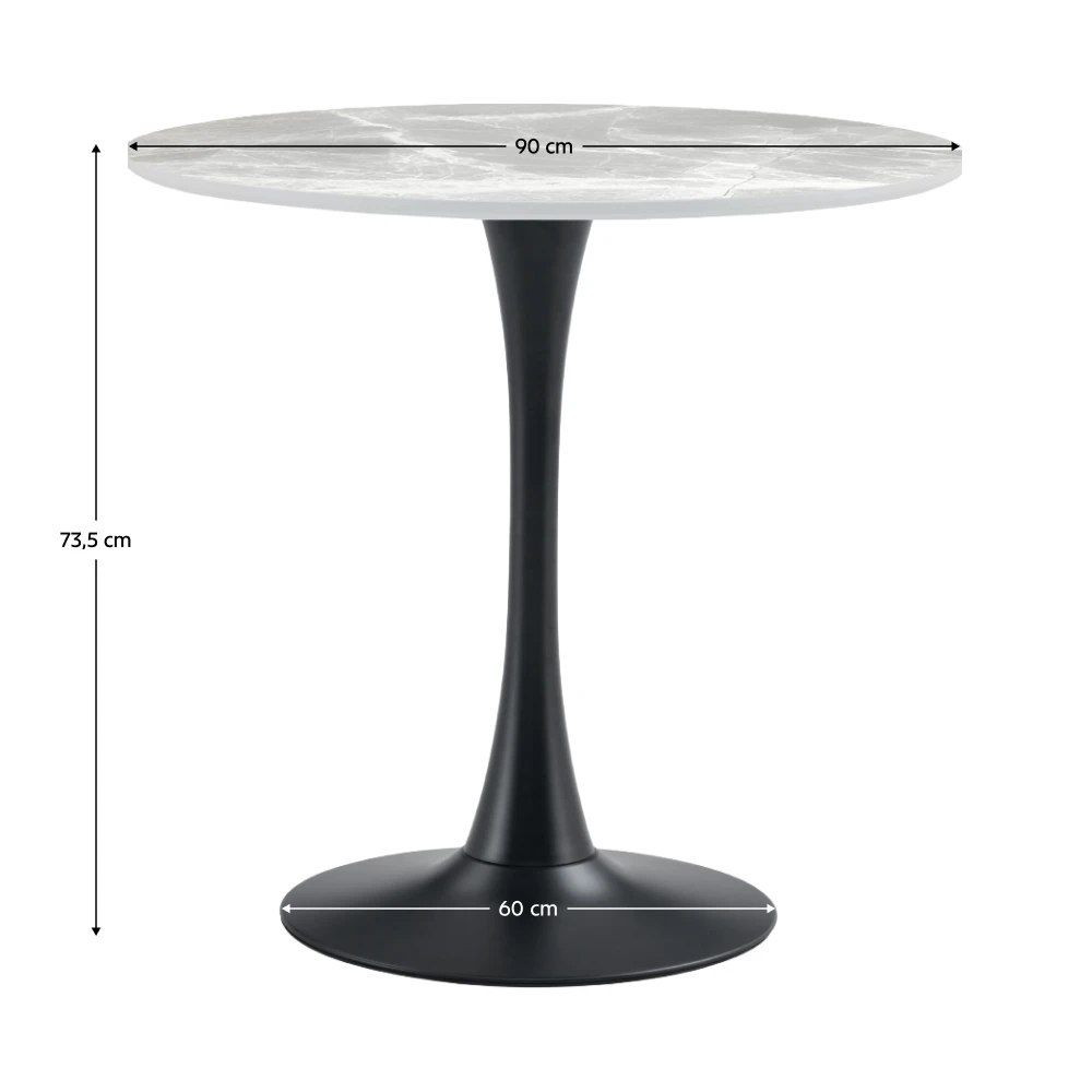 Elegantní kulatý jídelní stůl s deskou v dekoru šedého mramoru a černou kovovou podstavou je ideální volbou pro moderní interiéry. Spojuje luxusní vzhled s praktickým využitím a stane se stylovým centrem každé jídelny či kuchyně.