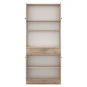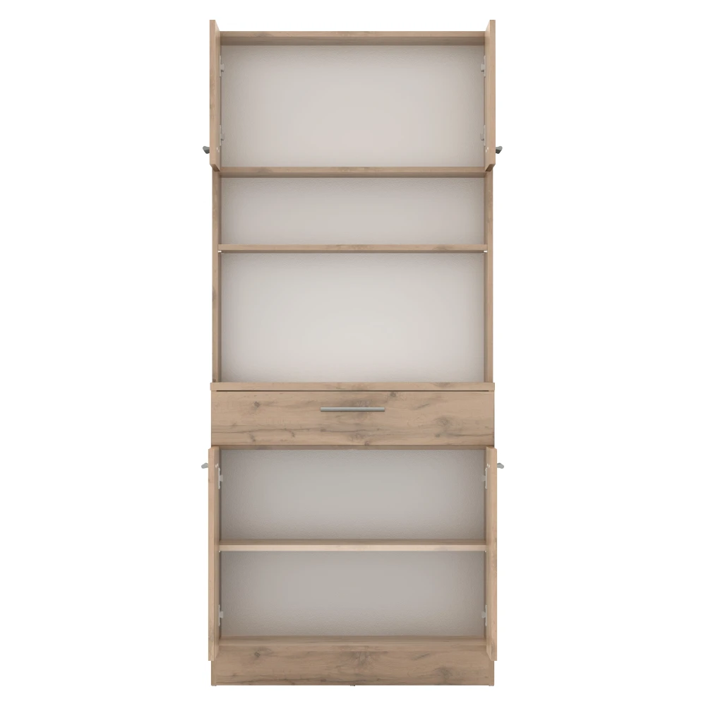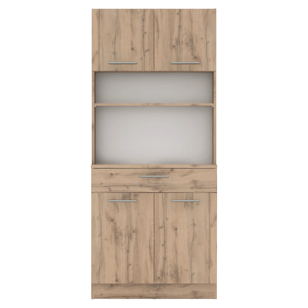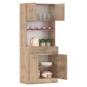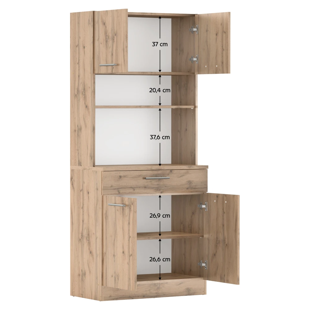 Kredenc nabízí bohatý úložný prostor – dvě horní skříňky s dvířky, dvě spodní skříňky a jednu prostornou zásuvku. Pohodlně do ní uložíte nádobí, kuchyňské potřeby, textilie nebo dekorace. Otevřené police uprostřed jsou ideálním místem pro vystavení oblíbených doplňků, rostlin či kuchařek, čímž vytvoříte útulný a osobitý vzhled místnosti.