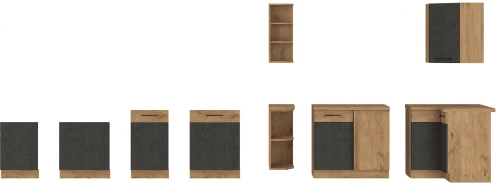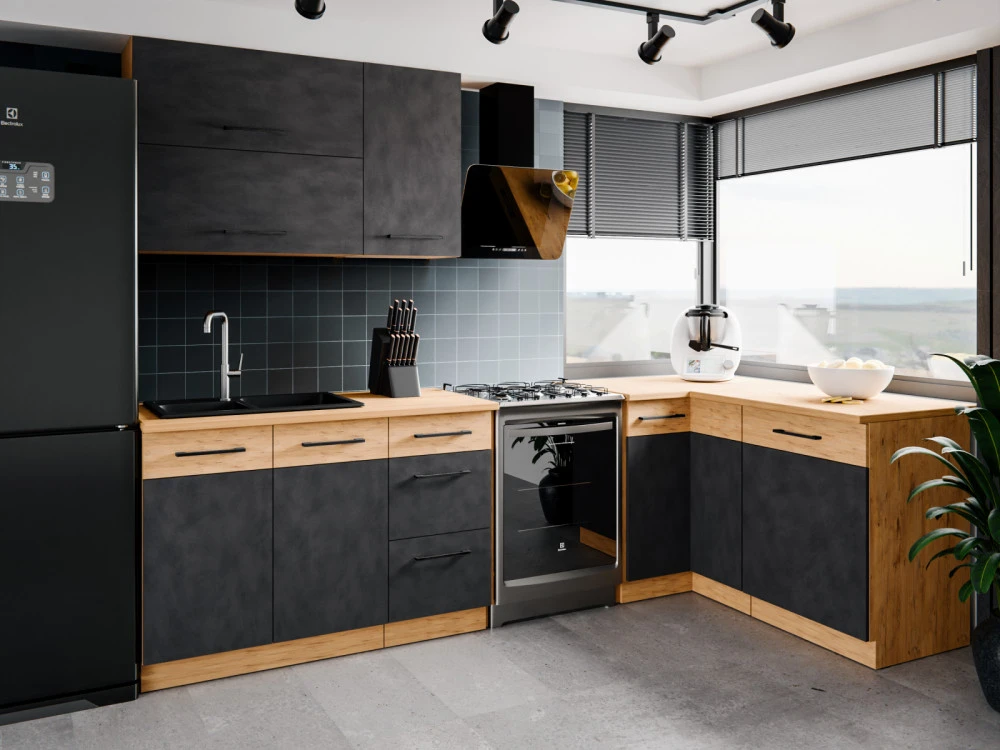 Dvířka v dekoru Matera vytvářejí výrazný kontrast, který v kombinaci s teplým odstínem dubu Lancelot působí moderně, ale zároveň útulně. Výsledkem je příjemná atmosféra, ve které se budete cítit dobře každý den.