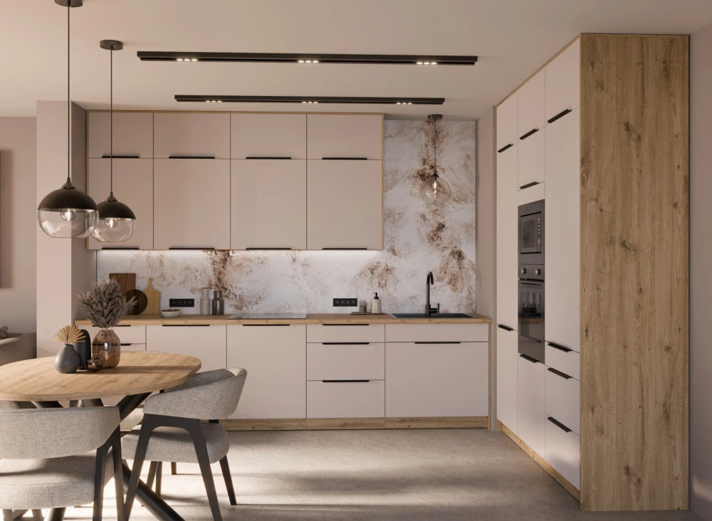Kolekce modulárních kuchyňských skříněk Selva zaujme svým harmonickým designem a nadčasovou elegancí. Dvířka v oblíbeném dekoru kašmír v kombinaci s přírodními detaily dodají interiéru svěží, čistý a zároveň útulný vzhled. Kuchyně tak nepůsobí pouze jako praktický prostor pro vaření, ale stává se přirozeným centrem domova, kde se budete cítit příjemně každý den.