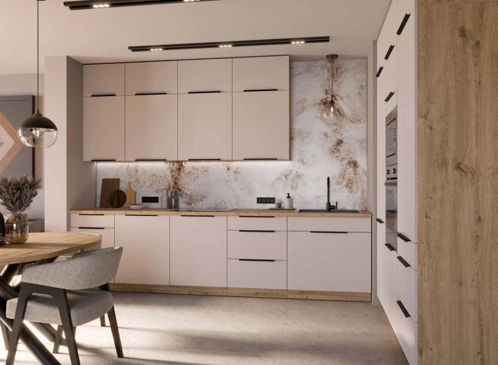Kolekce modulárních kuchyňských skříněk Selva přináší harmonický design a moderní eleganci, která dodá vaší kuchyni svěží a nadčasový vzhled. Dvířka v dekoru kašmír v kombinaci s přírodními detaily vytvářejí příjemnou, klidnou atmosféru pro každodenní vaření i setkávání.