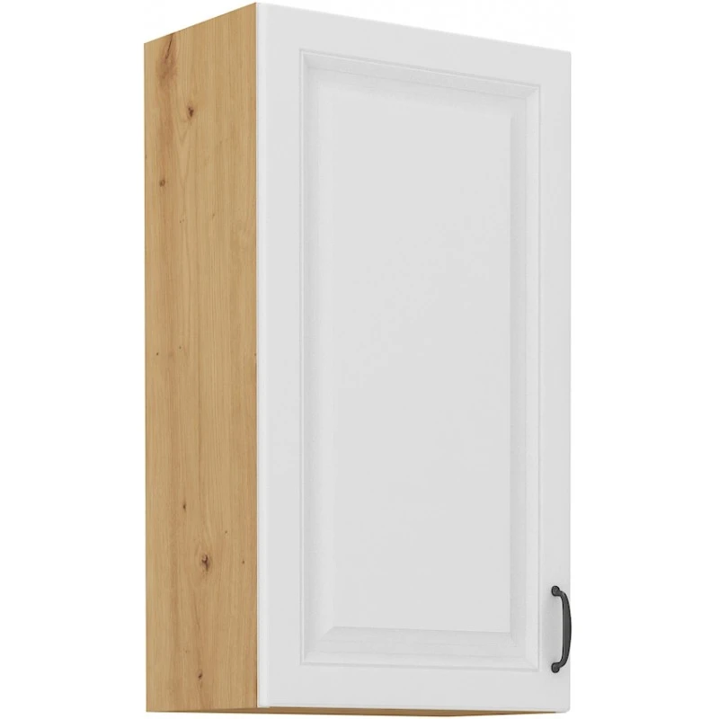 Horní kuchyňská skříňka je vyrobena z lamina tloušťky 16 mm bílé barvy. Korpus je v provedení dub artisan. Vnitřek skříňky má pak barvu bílou. Dvířka mají černý kovový úchyt (délka 124 mm). Jsou vybavena systémem tichého zavírání a při montáži si můžete zvolit pravé či levé otevírání dveří. Vnitřek skříňky obsahuje celkem tři police, které Vám poskytnou dostatek místa k uskladnění všeho, co budete v kuchyni potřebovat. V doplňkových fotografiích najdete další možnosti sestavení Vaši kuchyně. Nechte se inspirovat a poskládejte si z naší bohaté nabídky skříněk moderní a designovou kuchyň podle Vašich představ. Skříňka je dodávaná v demontu. Součástí je montážní plánek včetně všech potřebných spojovacích materiálů.