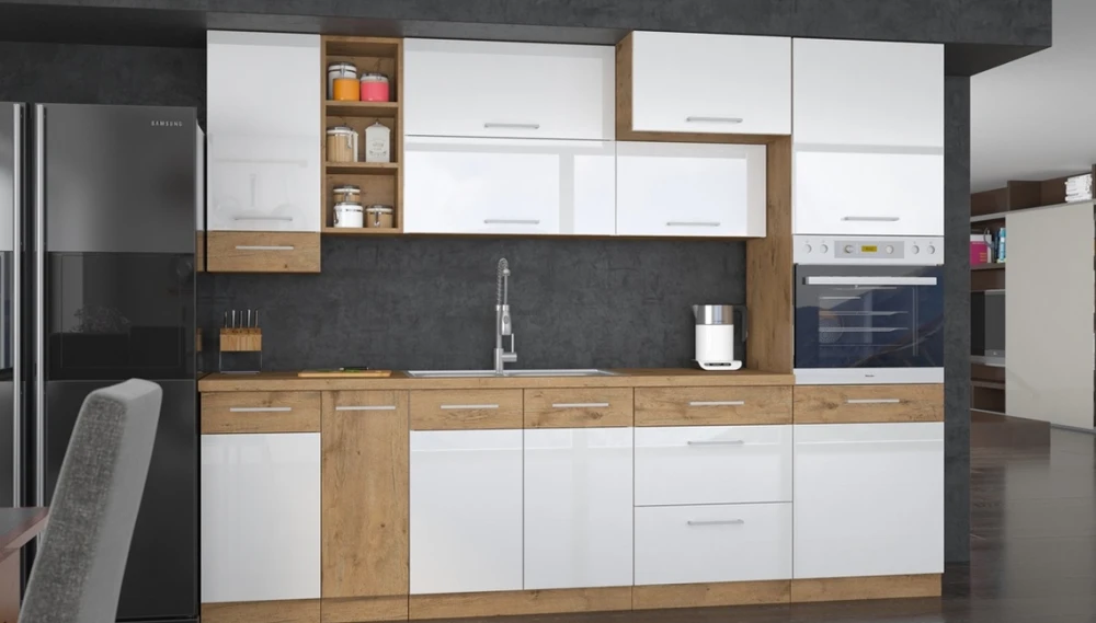 Vrchní kuchyňská skříňka 45G-72-1F je vyrobena z lamina v dekoru dub lancelot v kombinaci s vysokým leskem. Prohlédněte si širokou nabídku skříněk a vytvořte si kuchyň dle vlastních představ. Může být rohová, rovná, krátká i dlouhá. Fantazii se meze nekladou. V doplňkových fotografiích najdete pro inspiraci fotky kuchyní, které jsou z těchto skříněk sestaveny. Skříňka je dodávaná v demontu. Součástí je montážní plánek včetně všech potřebných spojovacích materiálů.