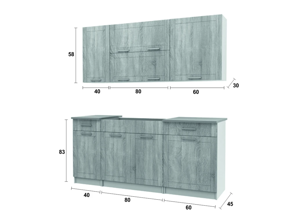 Potýkáte-li se s malými prostory a každý centimetr je pro Vás důležitý, pak je kuchyňská linka Adelia tou správnou volbou pro Vaši kuchyň. Je vyrobena v klsickém designu a skříňky si můžete sestavit buď tak, jak vidíte na úvodní fotografii, nebo si je můžete sestavit podle svých potřeb. Korpusy skříněk jsou bílé, dvířka jsou v dzénu olše. Všechny skříňky této sestavy jsou dodávány v demontu. Součástí je montážní plánek včetně všech potřebných spojovacích materiálů. Cena je uvedna za sestavu vyobrazenou na úvodní fotografii BEZ PRACOVNÍ DESKY. Spotřebiče,baterie a dekorace nejsou v ceně.