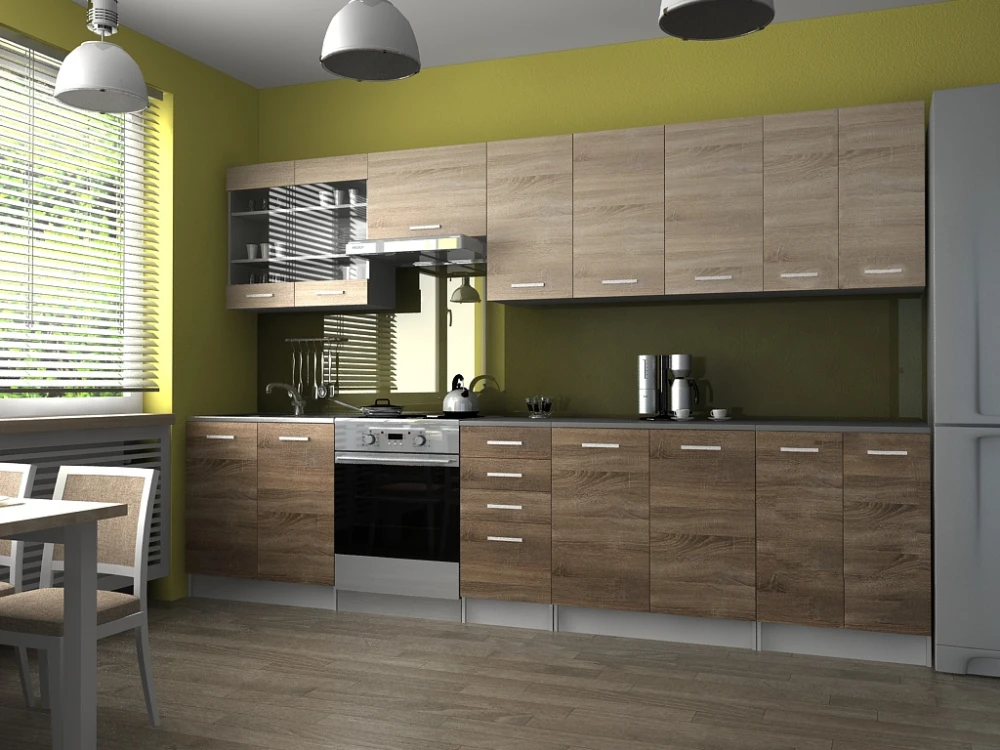 Kuchyňská linka Pamis je ideální volbou pro Vaši kuchyň. Je moderní a zároveň i praktická. Skříňky nabízejí dostatek úložného prostoru a pracovní plocha je také dostatečně prostorná. Korpusy skříněk jsou bílé. Vybrat si můžete z několika variant dekorů a rozměrů. Všechny tyto varianty najdete v naší nabídce a určitě si vyberete tu nejvhodnější pro Vaši kuchyň. Skříňky jsou dodávány v demontu. Součástí je montážní plánek včetně všech potřebných spojovacích materiálů. Cena je uvedna za sestavu vyobrazenou na úvodní fotografii BEZ PRACOVNÍ DESKY. Vyobrazené spotřebiče a dekorace nejsou v ceně.
