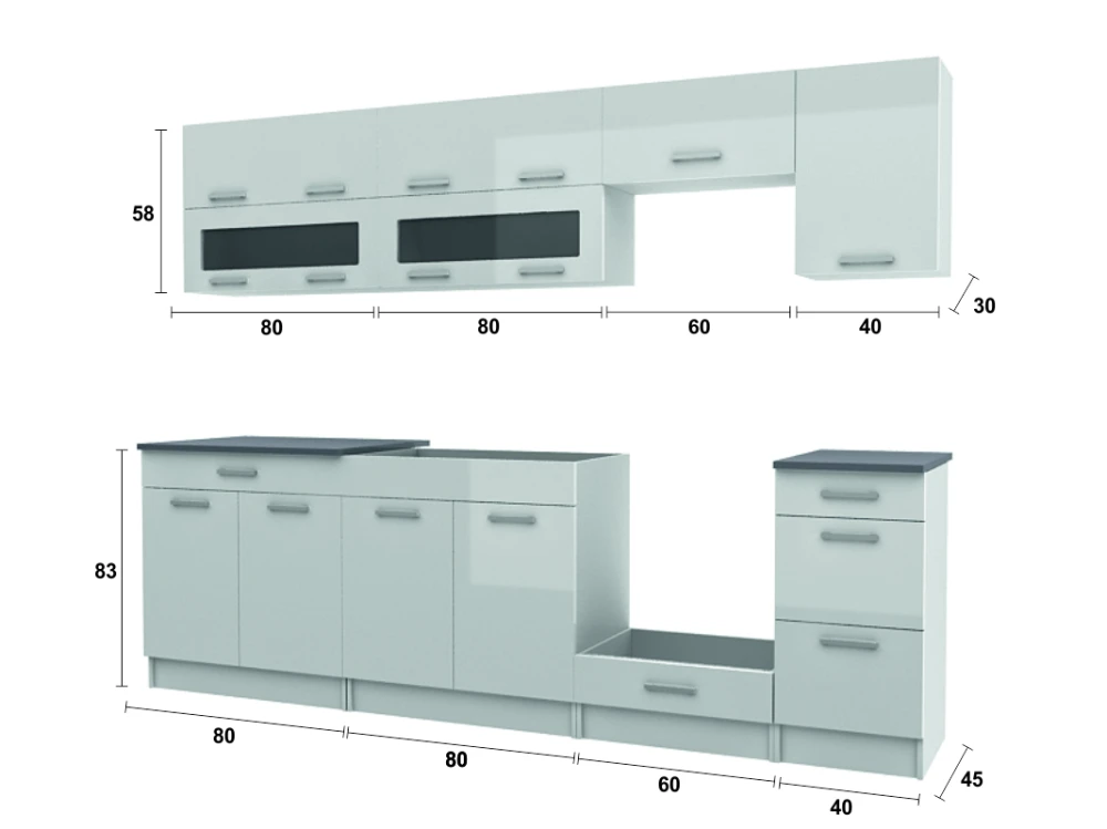 Kuchyňská linka Scary je praktická, účelná a navíc za rozumnou cenu. Kuchyňská linka je důležitým vybavením Vaší kuchyně, ale také designovým prvkem interiéru. Ať už to bude v paneláku, nebo rodinném domě, určitě se bude ve Vaší kuchyni krásně vyjímat. Skříňky nabízejí dostatek úložného prostoru na nádobí i dostatek pracovního prostoru. Kuchyň je vyrobená z lamina, které je odolné a snadné na údržbu. Korpusy skříněk jsou bílé, dvířka jsou ve vysokém lesku v trendy barvách. Skříňky jsou samostatné, takže si kuchyň můžete sestavit buď tak, jak je vyobrazeno na fotografii, nebo si je můžete sestavit podle toho, jak Vám to bude vyhovovat. Kuchyň je dodávána v demontu BEZ PRACOVNÍ DESKY. Součástí je montážní plánek včetně všech potřebných spojovacích materiálů. Cena je uvedna za sestavu vyobrazenou na úvodní fotografii. Spotřebiče,baterie a dekorace nejsou v ceně.