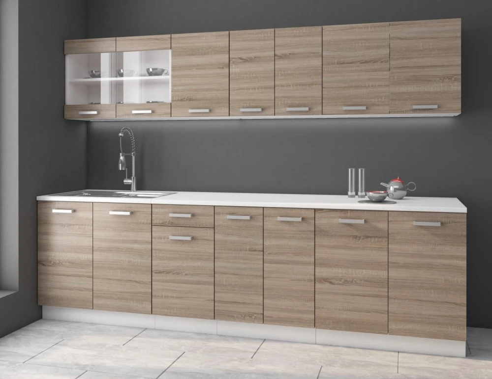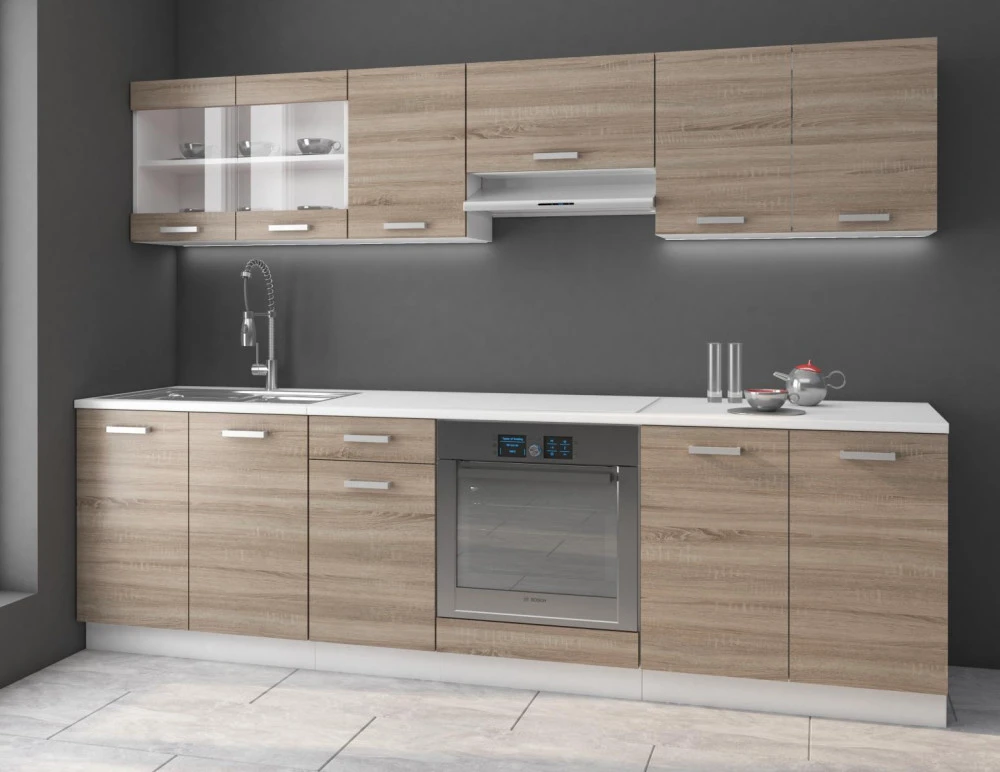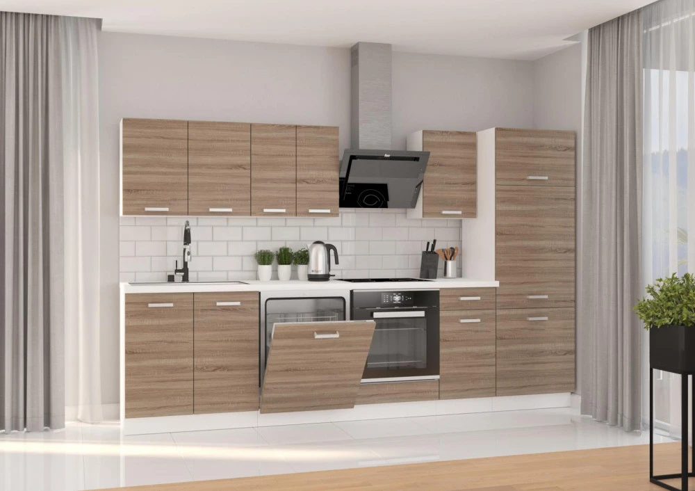 Zboží je dodáváno v demontu, součástí je montážní plánek včetně všech potřebných spojovacích materiálů. Vyobrazené spotřebiče, dřez, baterie a dekorace nejsou v ceně.