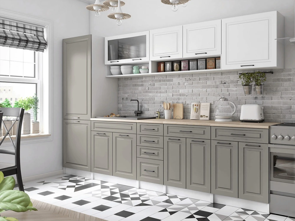 Kuchyňská linka Brigita je vyrobená ve venkovském stylu, který se hodí do kuchyně v paneláku i v rodinném domě. Tento styl má jedinečnou schopnost proměnit Vaši kuchyň v útulnou a zároveň funkční místnost, kde bude radost vařit i péct. Kuchyňská linka Brigita nabízí dostatek úložného i pracovního prostoru. Všechny skříňky jsou samostatné, takže si je můžete sestavit tak, jak Vám to vyhovuje. Korpusy skříněk jsou vyrobené z lamina 18 mm s hranami ABS a dvířka jsou MDF 16mm. Všechny skříňky jsou dodávány v demontu. Součástí balení je montážní plánek včetně všech potřebných spojovacích prvků. Cena je uvedena za sestavu vyobrazenou na úvodní fotografii BEZ PRACOVNÍ DESKY, s úchytkami, které jsou vyobrazeny v doplňkových fotografiích. Pracovní desku lze dokoupit nad každou skříňku zvlášť podle její šíře. Vyobrazené spotřebiče, dřez, baterie, doplňky a dekorace nejsou v ceně. Kuchyň bude dodaná s bílými korpusy a dvířky v kombinaci bílá a šedá.