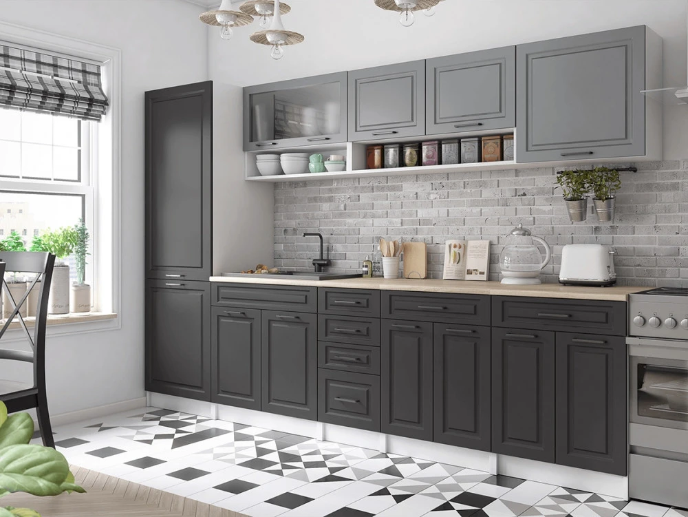 Kuchyňská linka Brigita je vyrobená ve venkovském stylu, který se hodí do kuchyně v paneláku i v rodinném domě. Tento styl má jedinečnou schopnost proměnit Vaši kuchyň v útulnou a zároveň funkční místnost, kde bude radost vařit i péct. Kuchyňská linka Brigita nabízí dostatek úložného i pracovního prostoru. Všechny skříňky jsou samostatné, takže si je můžete sestavit tak, jak Vám to vyhovuje. Korpusy skříněk jsou vyrobené z lamina 18 mm s hranami ABS a dvířka jsou MDF 16mm. Všechny skříňky jsou dodávány v demontu. Součástí balení je montážní plánek včetně všech potřebných spojovacích prvků. Cena je uvedena za sestavu vyobrazenou na úvodní fotografii BEZ PRACOVNÍ DESKY, s úchytkami, které jsou vyobrazeny v doplňkových fotografiích. Pracovní desku lze dokoupit nad každou skříňku zvlášť podle její šíře. Vyobrazené spotřebiče, dřez, baterie, doplňky a dekorace nejsou v ceně. Kuchyň bude dodaná s bílými korpusy a dvířky v šedém a grafit odstínu.