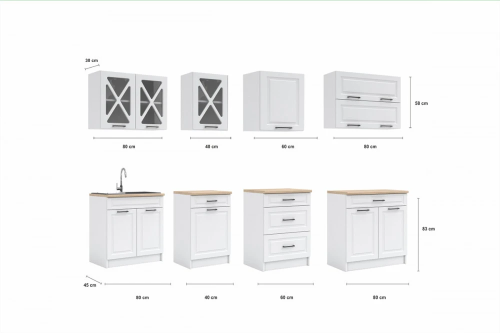 Kuchyňská linka Tyra je vyrobená ve velmi oblíbeném skandinávském stylu, který se hodí do kuchyně v paneláku i v rodinném domě. Tento styl má jedinečnou schopnost proměnit Vaši kuchyň v útulnou a zároveň funkční místnost, kde bude radost vařit i péct. Kuchyňská linka Tyra nabízí dostatek úložného i pracovního prostoru. Všechny skříňky jsou samostatné, takže si je můžete sestavit tak, jak Vám to vyhovuje. Korpusy skříněk jsou vyrobené z lamina 18 mm s hranami ABS a dvířka jsou MDF 16mm. Všechny skříňky jsou dodávány v demontu. Součástí balení je montážní plánek včetně všech potřebných spojovacích materiálů. Cena je uvedena za sestavu vyobrazenou na úvodní fotografii BEZ PRACOVNÍ DESKY, s úchytkami, které jsou vyobrazeny v doplňkových fotografiích. Pracovní desku lze dokoupit nad každou skříňku zvlášť podle její šíře. Vyobrazené spotřebiče, dřez, baterie, doplňky a dekorace nejsou v ceně.