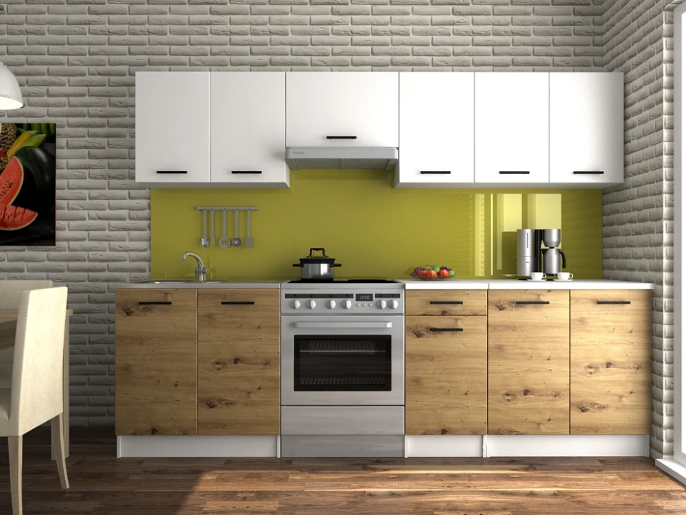 Kuchyňská linka Luigi je ideální volbou pro Vaši kuchyň. Je moderní a zároveň i praktická. Skříňky nabízejí dostatek úložného prostoru. Je vyrobená z lamina, které je odolné a snadné na údržbu. Díky svým rozměrům je vhodná i do malých kuchyní. Skříňky si můžete sestavit libovolně. Kuchyňská linka je dodávaná v demontu. Součástí balení je montážní plánek včetně všech potřebných spojovacích materiálů. Cena je uvedena za sestavu vyobrazenou na úvodní fotografii BEZ PRACOVNÍ DESKY. Kuchyň nabízíme v několika rozměrech i dekorech.Vyobrazené spotřebiče, dřez a dekorace nejsou v ceně.