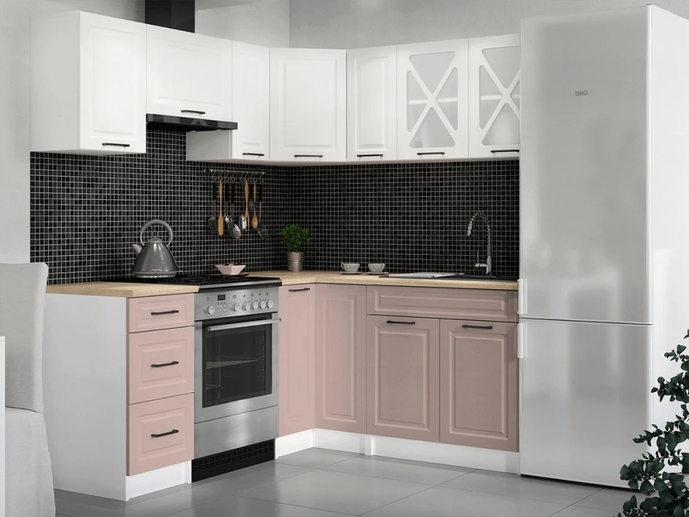 Kuchyňská linka Astra je vyrobená ve venkovském stylu, který se hodí do kuchyně v paneláku i v rodinném domě. Tento styl má jedinečnou schopnost proměnit Vaši kuchyň v útulnou a zároveň funkční místnost, kde bude radost vařit i péct. Rohová kuchyňská linka Astra nabízí dostatek úložného i pracovního prostoru. Kuchyňské skříňky jsou samostatné, takže si je můžete sestavit podle potřeby tak, jak Vám to vyhovuje. Korpusy skříněk jsou vyrobené z lamina 18 mm s hranami ABS a dvířka jsou MDF 16mm. Všechny skříňky jsou dodávány v demontu. Součástí balení je montážní plánek včetně všech potřebných spojovacích prvků. Cena je uvedena za sestavu vyobrazenou na úvodní fotografii BEZ PRACOVNÍ DESKY, s úchytkami, které jsou vyobrazeny v doplňkových fotografiích. Pracovní desku lze dokoupit nad každou skříňku zvlášť podle její šíře. Vyobrazené spotřebiče, dřez, baterie, doplňky a dekorace nejsou v ceně. Kuchyň bude dodaná s bílými korpusy a dvířky v dekóru bílá a růžová.