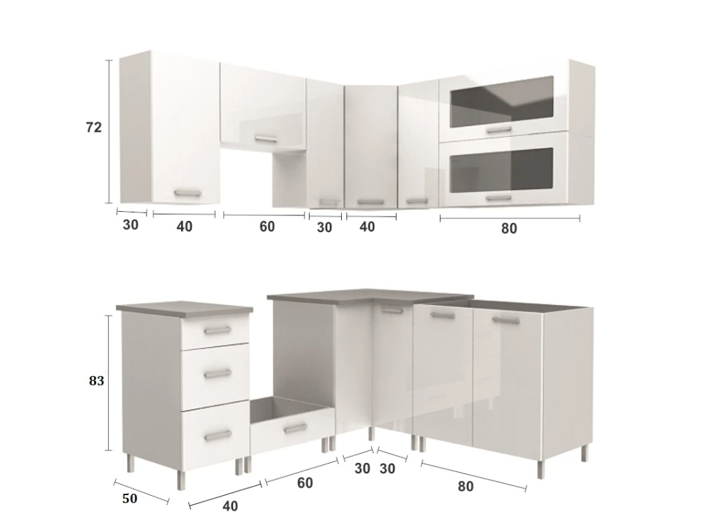 Rohová kuchyňská linka Grepolis v moderním designu je vyrobena tak, že si ji můžete sestavit podle potřeby tak, jak Vám to vyhovuje. Hodí se do každého typu kuchyně a nabízí dostatek úložného prostoru. Kuchyňská linka je na nožkách a díky tomu je prostor pod linkou lépe přístupný při úklidu. Korpusy skříněk jsou bílé, dvířka jsou ve vysokém lesku v několika módních odstínech a se třemi typy úchytek. Všechny tyto varianty najdete v naší nabídce a určitě si vyberete tu pravou po Váši kuchyň. Skříňky jsou dodávány v demontu. Součástí je montážní plánek včetně všech potřebných spojovacích materiálů. Cena je uvedna za sestavu vyobrazenou na úvodní fotografii BEZ PRACOVNÍ DESKY, s úchytkami, které jsou vyobrazeny v doplňkových fotografiích. Vyobrazené spotřebiče, doplňky a dekorace nejsou v ceně.