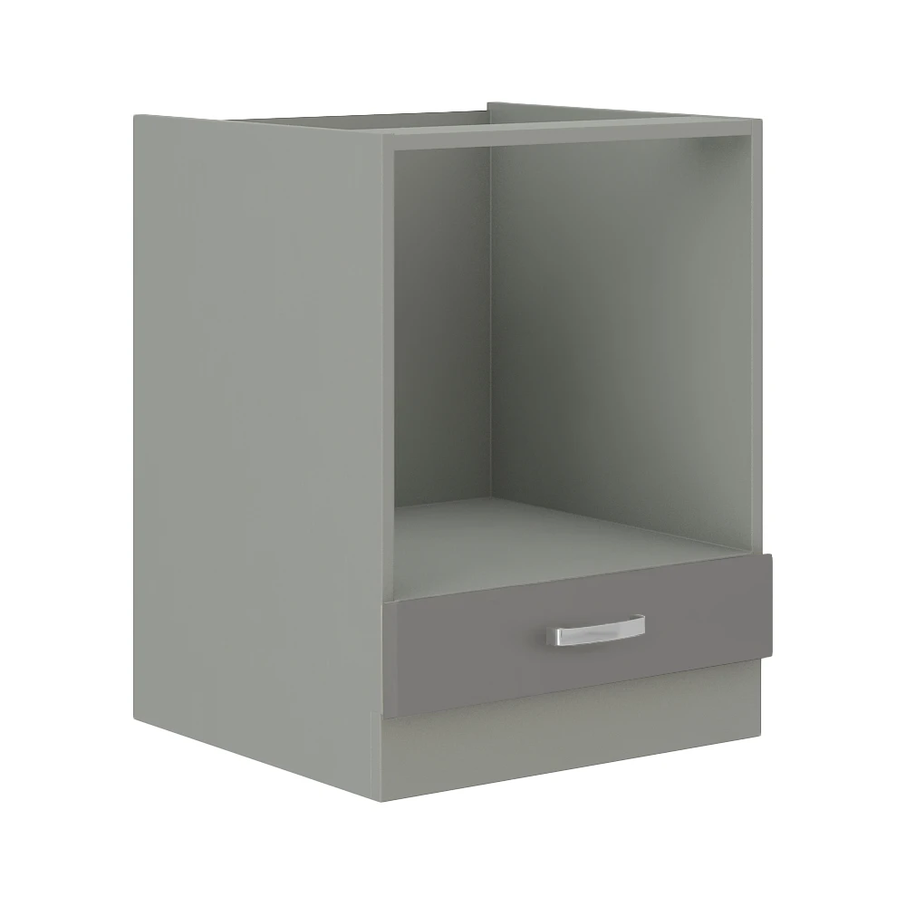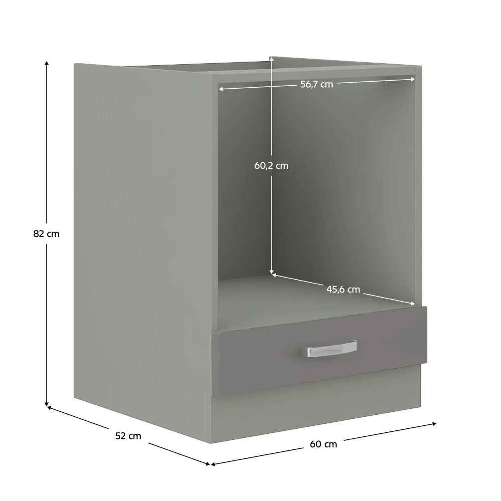 Dolní skříňka, materiál: DTD laminovaná, provedení: šedý vysoký lesk, rozměry ŠxVxH: 60x82x52 cm. Vnitřní rozměr (ŠxHxV): 56,7x45,6x60,2 cm Je určena k zakomponování sporáku do kuchyňské linky. Dodáváno v demontu.Bez pracovní desky.
