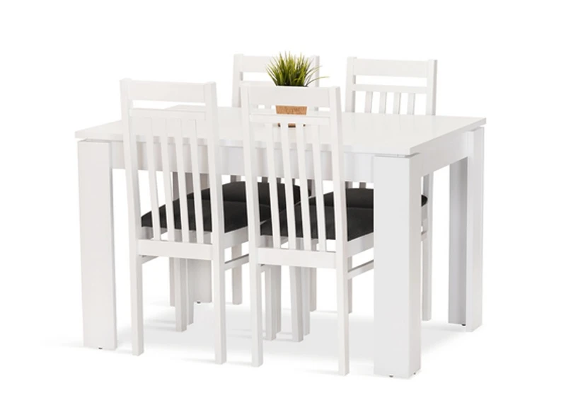 Jídelní sestava Dante 4 se skládá ze stolu a čtyř židlí. Tato jídelní sestava splní svůj účel na výbornou nejen v kuchyni, ale i v jídelně, nebo obývacím pokoji s jídelním koutem. Svou vysokou kvalitou a precizním zpracováním, uspokojí všechny budoucí, i ty velmi náročné, uživatele. Stůl je vyrobený z bílého matného lamina tl.22 mm, kostry židlí z bukového dřeva, barveného na bílou barvu. Jídelní sestava je dodávaná v demontu. Součástí balení je schématický montážní návod, včetně všech potřebných spojovacích prvků. Cena je uvedena za jídelní stůl a 4 židle.