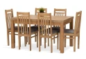 Jídelní sestava Meteor 6 se skládá z rozkládacího stolu a šesti židlí. Tato jídelní sestava splní svůj účel na výbornou nejen v kuchyni, ale i v jídelně, nebo obývacím pokoji s jídelním koutem. Svou vysokou kvalitou a precizním zpracováním, uspokojí všechny budoucí, i ty velmi náročné, uživatele. Nohy stolu a kostry židlí jsou vyrobeny z bukového dřeva, mořeného tak, aby ladily s deskou stolu, která je vyrobená z lamina v dekoru dub artisan. Jídelní sestava je dodávaná v demontu. Součástí balení je schématický montážní návod, včetně všech potřebných spojovacích prvků. Cena je uvedena za jídelní stůl a 6 židlí. Úvodní fotografie je ilustrační. Židle budou dodány v modré barvě.