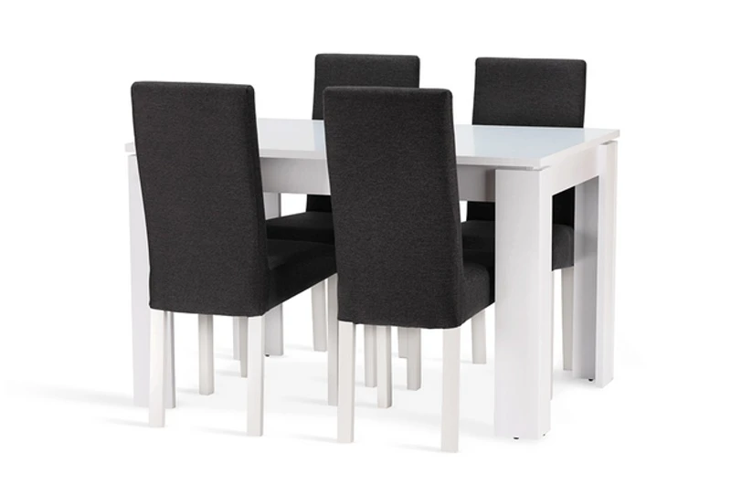 Jídelní sestava Neon 4 se skládá ze stolu a čtyř židlí. Tato jídelní sestava svou vysokou kvalitou a precizním zpracováním uspokojí všechny budoucí uživatele. Stůl je vyrobený z bílého matného lamina tl.22 mm, kostry židlí z bukového dřeva, barveného na bílou barvu. Jídelní sestava je dodávaná v demontu. Součástí balení je schématický montážní návod, včetně všech potřebných spojovacích prvků. Cena je uvedena za jídelní stůl a 4 židle. Úvodní fotografie je ilustrační. Židle budou dodány v modré barvě.