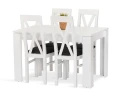 Jídelní sestava Valdo 4 se skládá ze stolu a čtyř židlí. Tato jídelní sestava splní svůj účel na výbornou nejen v kuchyni, ale i v jídelně, nebo obývacím pokoji s jídelním koutem. Svou vysokou kvalitou a precizním zpracováním, uspokojí všechny budoucí, i ty velmi náročné, uživatele. Stůl je vyrobený z bílého matného lamina tl.22 mm, kostry židlí z bukového dřeva, barveného na bílou barvu. Jídelní sestava je dodávaná v demontu. Součástí balení je schématický montážní návod, včetně všech potřebných spojovacích prvků. Cena je uvedena za jídelní stůl a 4 židle.